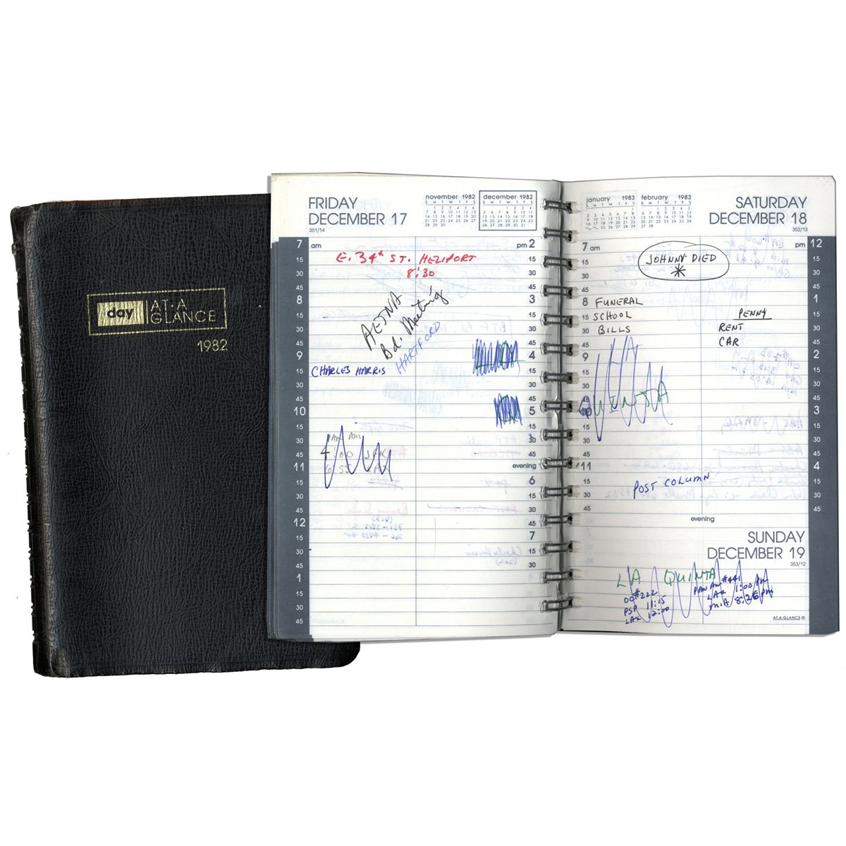 Arthur Ashe's 1982 day planner. Journal was consistently used by Ashe all year to remember appointments and record the important events in his busy life, which changed dramatically in 1980 when he survived a heart attack and underwent a quadruple bypass, forcing him to retire. He didn't slow down, though, and Ashe's priorities are revealed through his concise, utilitarian entries, which serve as reminders for his various public engagements and events of personal significance to him. In tennis, Ashe notes various worldwide match-ups, including Wimbledon, the Davis Cup, the U.S. Open and many more. His media appearances are abundant, and include almost every major television network, including ABC, CBS and more. Travel this year was widespread, from England to Monte Carlo, Rome to Japan. He also notes various personal events, birthdays, anniversaries, a fishing trip and the like, with a ''Johnny Died'' notation on December 18. He also keeps track of sporting events across all disciplines, including the Super Bowl. Notations in Ashe's hand appear on most every page of the spiral-bound Day-At-A-Glance book, save for a a few days off the whole year. Features a black faux-leather soft cover. Measures 5.75'' x 8.25''. In very good condition, with mild toning throughout. With an LOA from Arthur Ashe's widow.