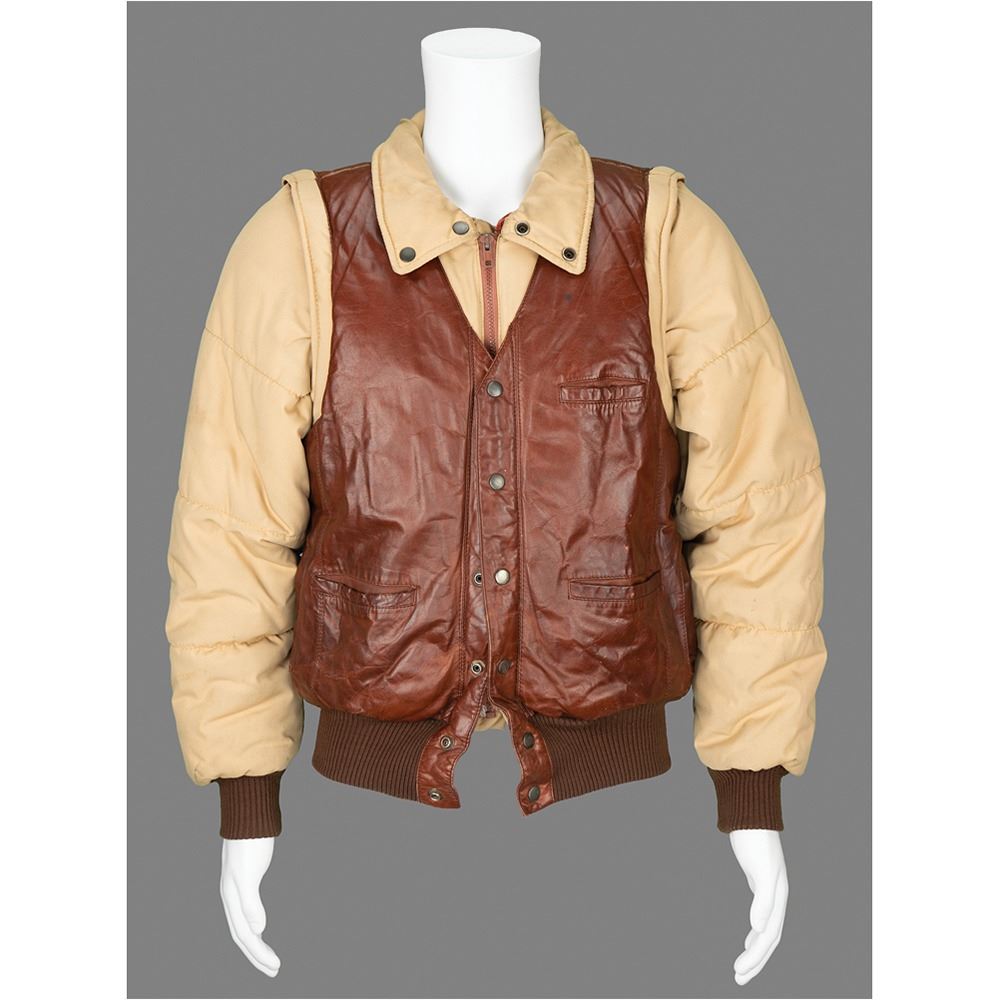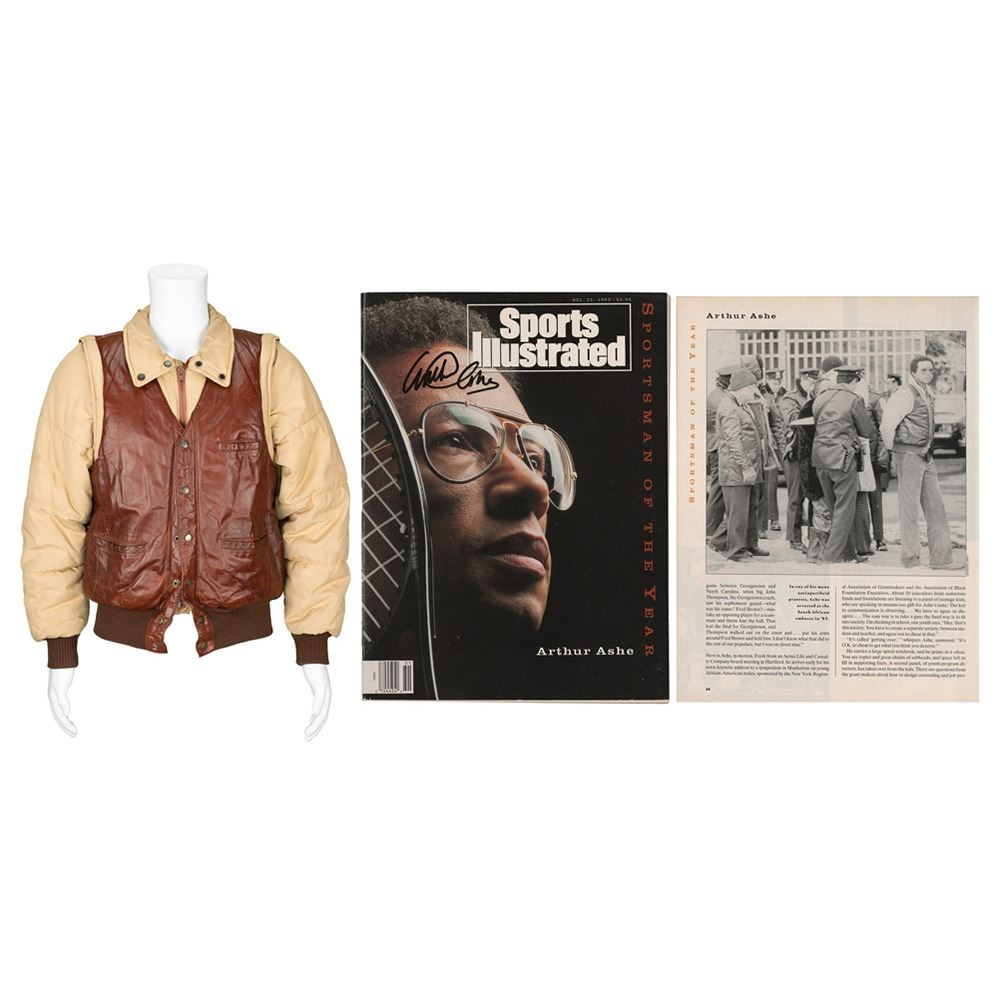 Ashe’s personally-owned and -worn Comstock winter jacket, no size (likely medium), with brown leather and tan cloth exterior featuring snap closures over a main zippered front, and zip-off shoulder sleeves. Ashe is pictured wearing this jacket on page 24 of the December 1992 issue of Sports Illustrated honoring him as the “Sportsman of the Year,†which shows Ashe being handcuffed and arrested for picketing the South African Embassy in Washington, D.C. in 1985. He is also seen wearing this jacket in a poignant photograph in his memoir, Days of Grace, taken by his wife Jeanne as he was being discharged from New York Hospital on January 18, 1993, just 19 days before his death. Expected wear from use.