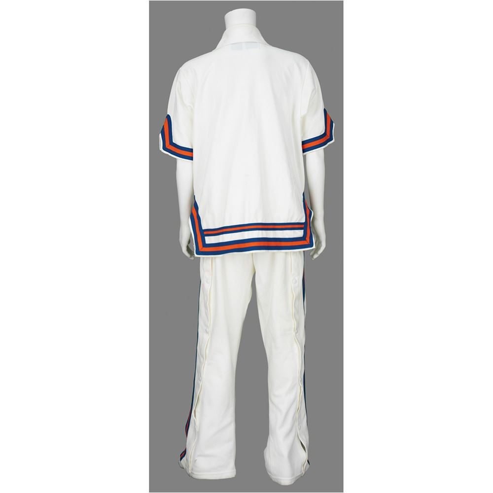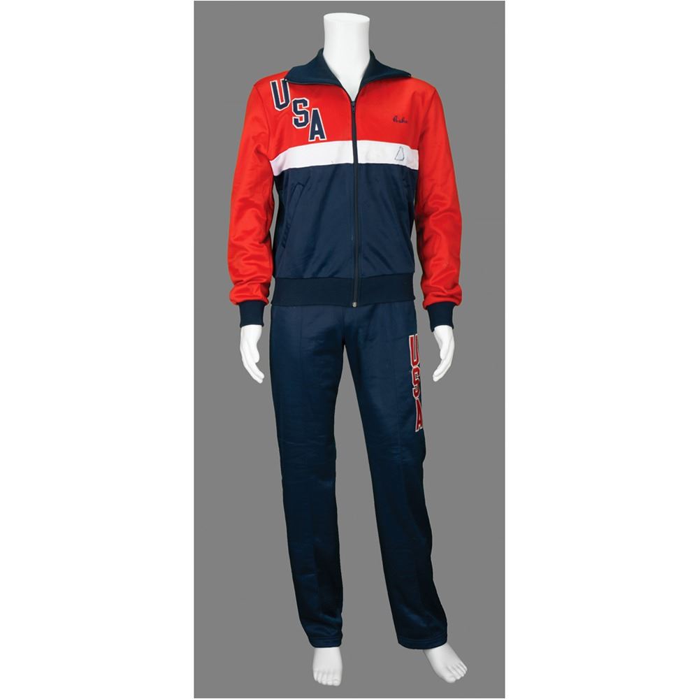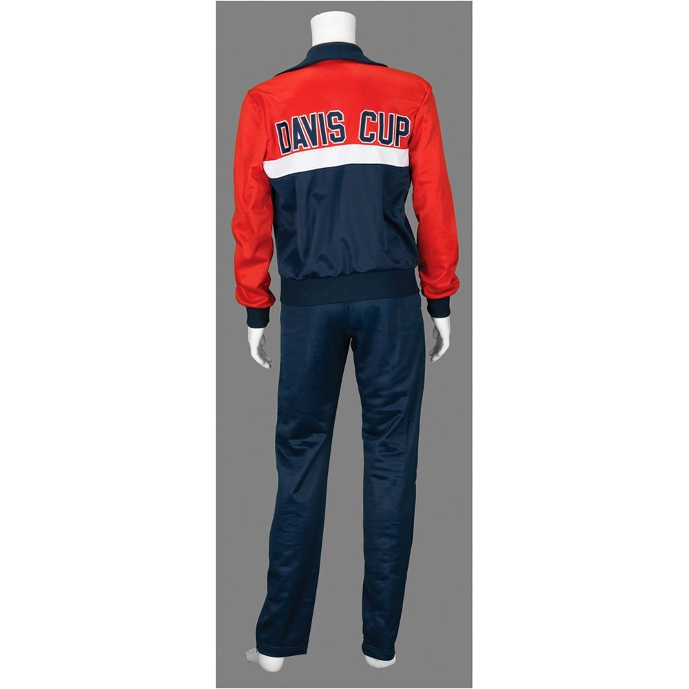 Ashe's personally-issued, -owned, and -worn Davis Cup jacket and pants from 1984. The red, white and blue zip-up Adidas jacket, size L, features lettering sewn onto the back reading, “Davis Cup†and “USA†to the front, with Ashe's name embroidered over the left breast. The navy blue pants, size M, feature zippered pockets, a drawstring waistband, and “USA†letter patches sewn along the left leg. Ashe is pictured wearing this outfit next to John McEnroe in an image featured in his memoirs, Days of Grace. Expected wear from use, including stains and adhesive residue.