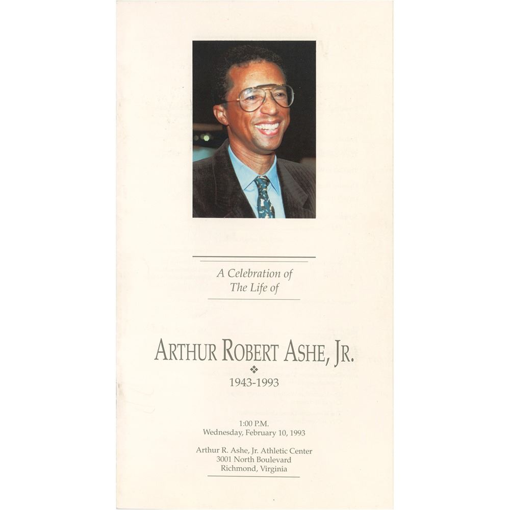 The funeral memorial service program for the life of Arthur Ashe, four pages, 6 x 11, with various memorial services, including hymns and speeches by family and friends. Memorial was held at the Arthur Ashe Athletic Center in Richmond, Virginia on February 10, 1993. The front cover features a nice image of Ashe smiling, and reads, in part: “A Celebration of the Life of Arthur Robert Ashe, Jr. 1943-1993.â€