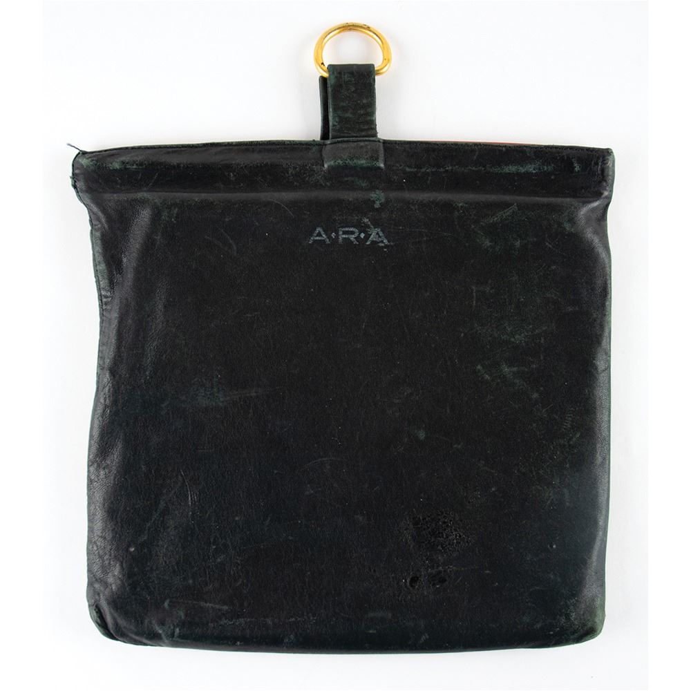 Ashe's personally-owned and -used monogrammed travel bag, 10.5 x 12, with Ashe's initials “A.R.A.†printed near the mouth of the black leather bag that he undoubtedly used extensively in his busy global travel schedule. The bag is lined in red leather and features leather loops sewn into the top with a metal D-ring for hanging. The bag is worn and soiled from use, with fading to monogram.
