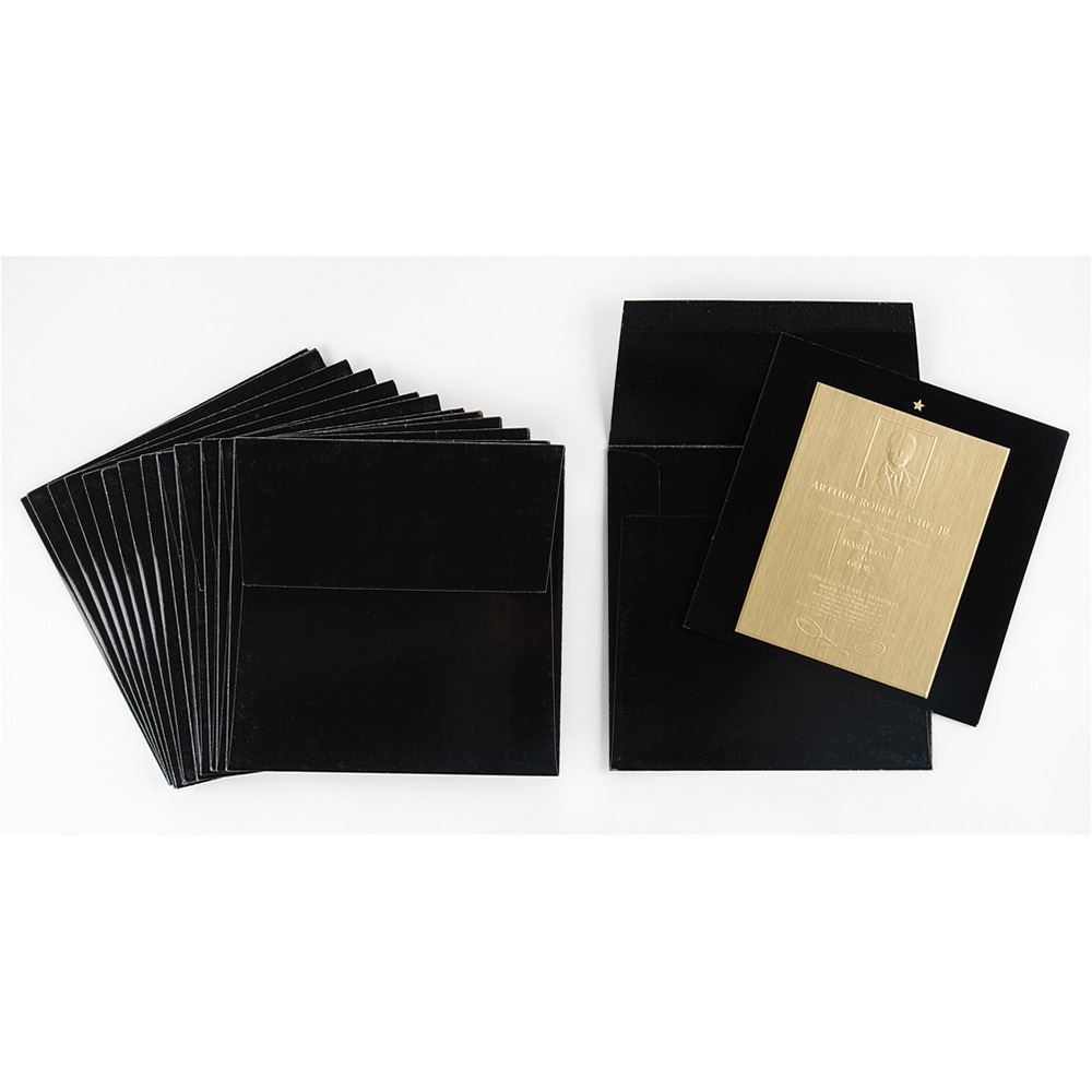 Lot of 14 programs from the Arthur Ashe gravestone ceremony in Richmond, Virginia. The Virginia native requested that he be buried in Richmond, next to his mother who died when Ashe was only six years old. Each card-style program, 7.25 x 7.25, is made of high-gloss black paper with a gold overlay on the cover embossed with Ashe's image and listing his greatest achievements as an athlete, scholar, and humanitarian. Each card opens to the itinerary of the service printed in gilt, which includes a poetry reading by Maya Angelou. Each program is housed in a matching envelope. Scattered shallow scratches and edge wear.