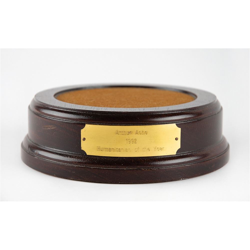 A Humanitarian of the Year award base presented to Ashe. The circular wooden award base, 6.75Ë in diameter, features a brass front plate that reads: “Arthur Ashe / 1992 / Humanitarian of the Year.â€