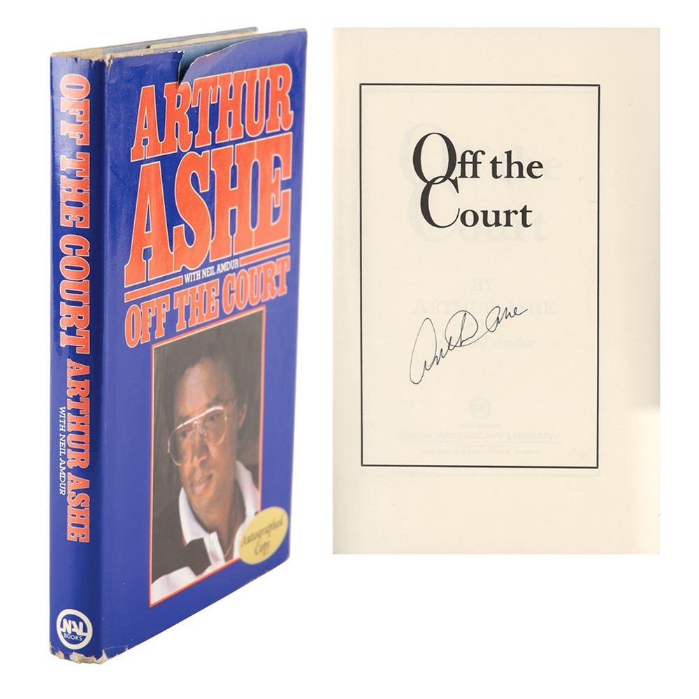 A first edition of Off the Court, published by New American Library in 1981, hardcover with dust jacket, signed on the half-title page in black ink by Ashe.
