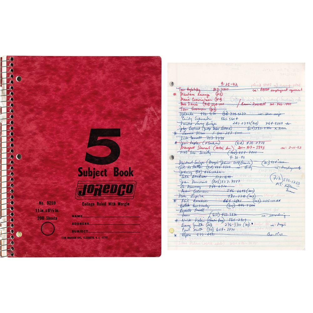 Ashe’s spiral-bound notebook containing his handwritten notes from his final days. The JoRedCoHe notebook, 9 x 11, was used by Ashe to record the names and numbers of the people he contacted for the last time in 1992 and 1993, with Ashe filling out 18 pages of the notebook (the majority featuring handwriting to the front and back) in blue, red, and black ink. The installments begin on September 25, 1992, and conclude on February 2, 1993, just four days before his death. Ashe jots the names and numbers of his contacts with the occasional reminder, such as, “Clinton letter†or “Send Davis Cup outfit to Hall of Fame.†A sampling of some of the more notable names listed include Spike Lee, Magic Johnson, Diana Ross, Daryl Hannah, Jesse Jackson, and Ethel Kennedy.
