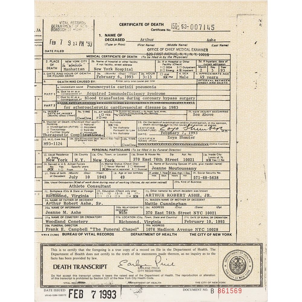 Ashe's death certificate from the New York Department of Health, one page, 8.5 x 11, which identifies the cause of death as “Pneumocystitis carinii pneumonia†due to AIDS as a consequence of “Blood transfusion during coronary bypass surgery,†with time and place as 3:13 p.m. on February 6, 1993, at New York Hospital in Manhattan.