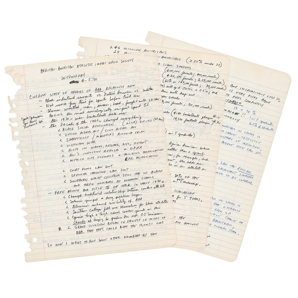 Ashe’s handwritten speech outline on “African-American Athletes Impact Upon Society,†penned in blue and black ballpoint on five total pages, with excellent content on politics, race, history and culture, with detailed notes, statistics, and his personal views on athletic programs in schools and black athletes in America. He opens by providing an overview of the historical background on the African American athlete: “Current state of affairs of AAA relatively new: black indentured servants vs. Native American vs. whites / not much free time for sports before Civil War / Slaves wrestled, ran, swam, boxed, fought with sticks. / Jack Johnson, Joe Louis, Muhammad Ali / Boxing the most sociologically import. sport til the 1970's when basketball took over. / The decade of the 1960's changed everything.†Over the course of the talk, Ashe makes four main points related to education and socio-economics, including, “…the success of African Americans in sports is proof positive that…African Americans can do anything anyone else can do…white America, for the first time, saw the records and limits they came to believe as sacrosanct smashed by members of a group they assumed to be inferior.''