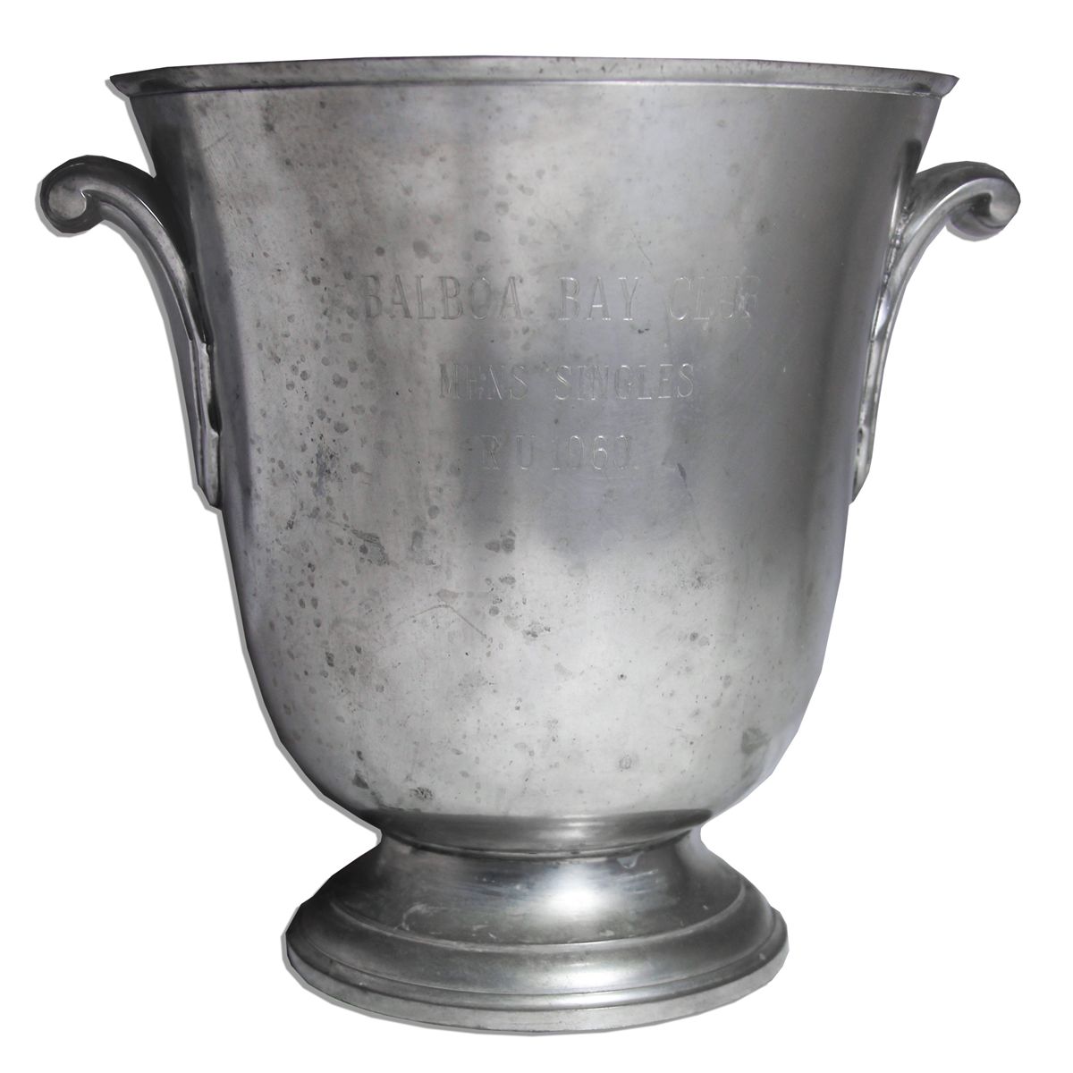 Tennis superstar Arthur Ashe trophy from the 1969 Balboa Beach Club invitational held on 22 February 1969. Ashe's career was taking off like wildfire the same year he won this trophy, and the following year, he officially went professional. Silver trophy has ''Balboa Bay Club / Mens Singles / R U 1969'' engraved across front. Trophy is made by Titre Legal, as is engraved to bottom of award. Measures 9'' x 8'' with spotted tarnishing throughout. Very good condition. With an LOA from Arthur Ashe's widow.