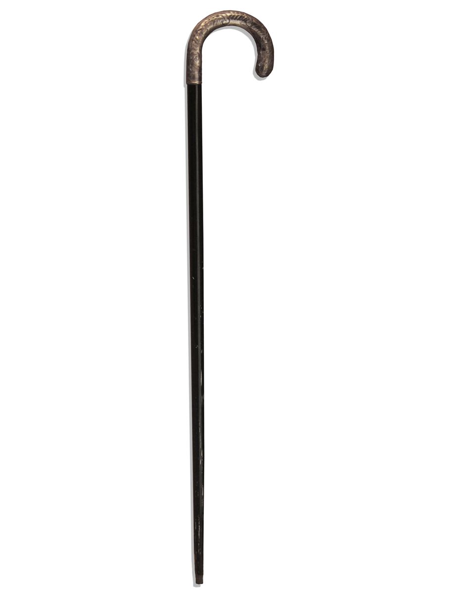 Cane owned by Arthur Ashe. Cane features a Tourist or ''J'' Handle, made out of engraved silver. Wooden shaft is painted a shiny black. Lower tip, possibly made of silver to match the handle, is now missing. Shaft shows scratches. Cane measures 35.5'' in height. Overall good condition. With an LOA from Ashe's widow.