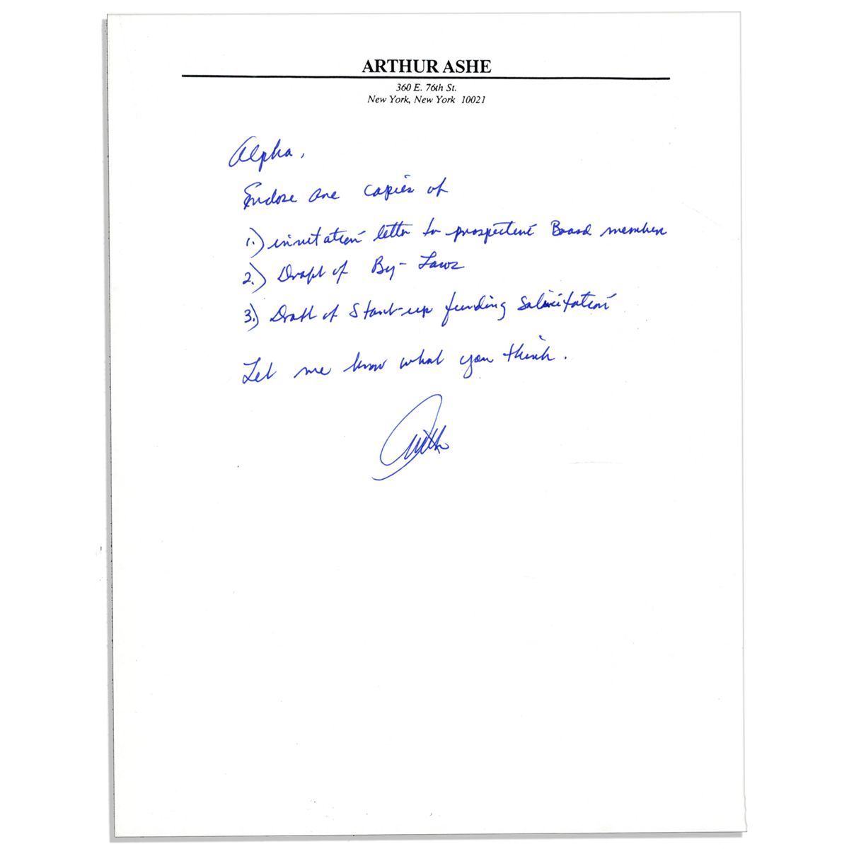 Arthur Ashe handwritten note signed ''Arthur'' regarding the African American Athletic Association, with a report outlining ways to garner new board members and general by-laws, as Ashe was already serving on the board. 20+ page 8.5'' x 11'' report lists the association's goals and details its fiscal budget. Includes an autograph note signed in Ashe's hand, on his personal letterhead, reading in full: ''Alpha, Enclosed are copies of 1. invitation letter to prospective board members 2. Draft By-Laws 3. Draft of Start-up funding solicitation. Tell me what you think.'' Signed ''Arthur''. Housed in original manila envelope with Ashe's printed return address, addressed in hand to a Dr. Alpha Alexander. Near fine. Includes LOA from Ashe's widow.