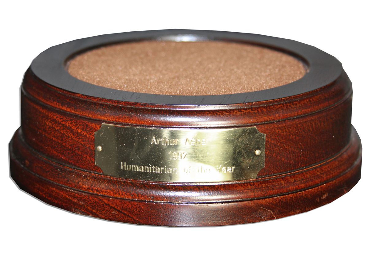 Humanitarian of the Year award base presented to Arthur Ashe. Circular wooden award base features a brass front plate which reads, ''Arthur Ashe / 1992 / Humanitarian of the Year''. Base measures 6.75'' in diameter and 2'' high. Felt covers top and bottom. Near fine condition. With an LOA from Ashe's widow.