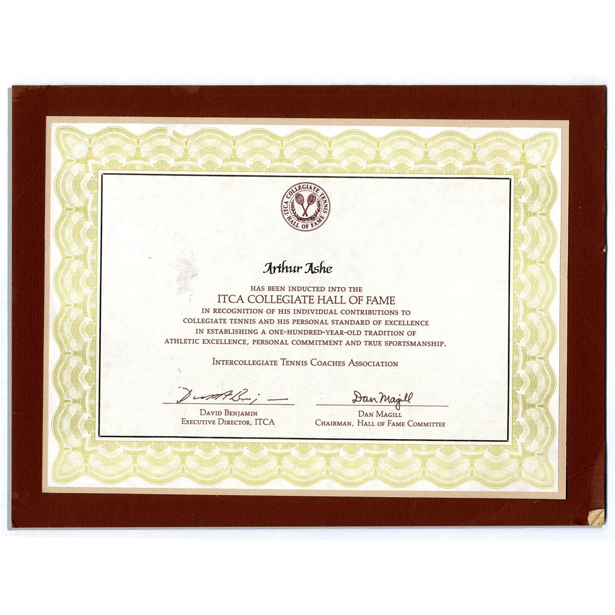 Certificate presented to Arthur Ashe from the Intercollegiate Tennis Hall of Fame. Certificate inducts Ashe into the ITC Hall of Fame, ''...in recognition of his individual contributions to collegiate tennis and his personal standard of excellence...'' Signed by David Benjamin, Executive Director and Dan Magill, Hall of Fame Chairman. Certificate measures 10.5'' x 7.75'', mounted to a board which measures 12'' x 9''. Very good condition. With an LOA from Ashe's widow.