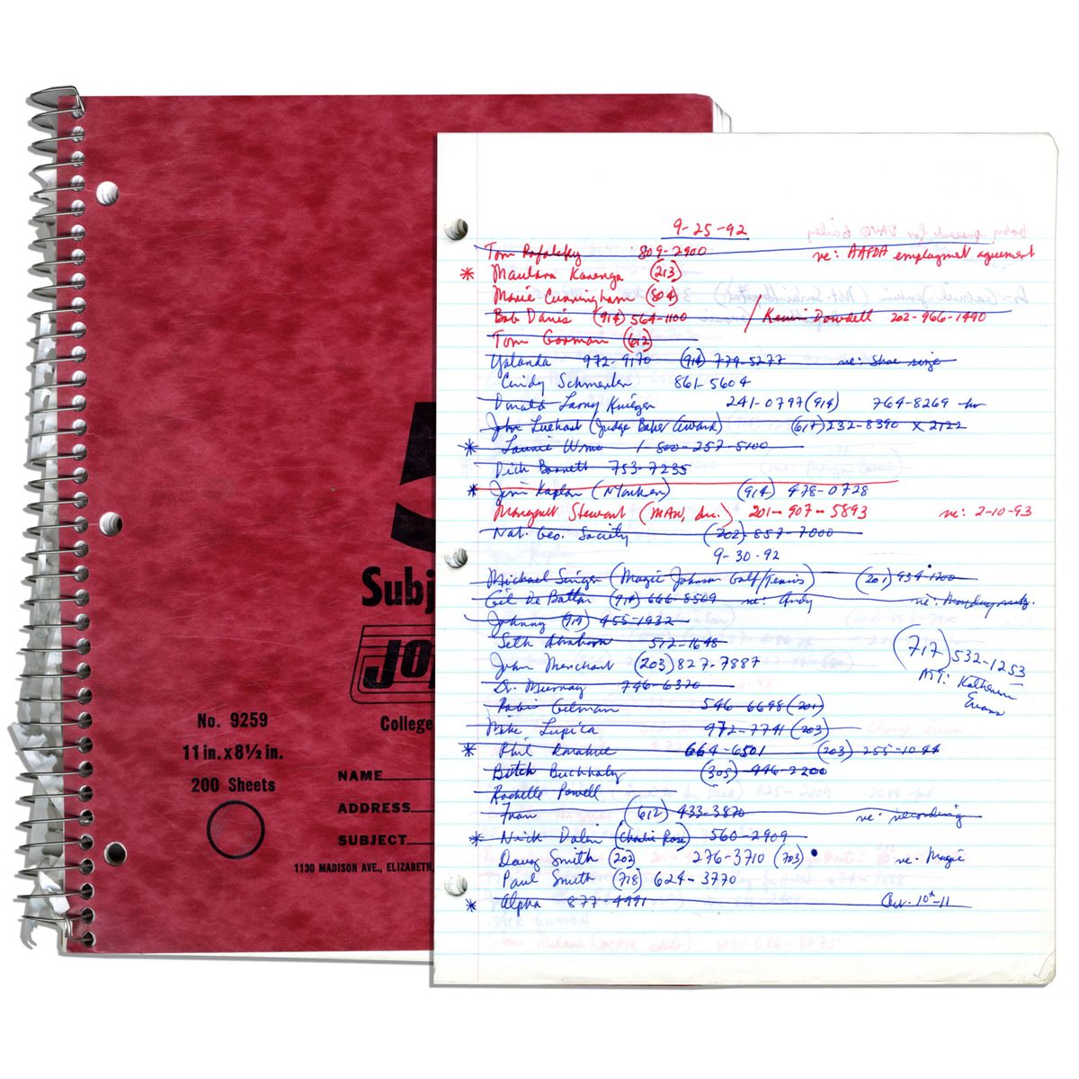 Arthur Ashe's notebook featuring his autograph notes from his final days. He used these pages to record the names and numbers of the people he contacted for the last time in 1992 & 1993. The book opens to his notation of the date as 25 September 1992 as a heading. Beneath, Ashe jots the names and numbers of his contacts with the occasional reminder such as, ''Clinton letter'' and ''Send Davis Cup outfit to Hall of Fame''. The next date that appears is 30 October 1992, followed by a handful of dates in November, December and January, concluding with 2 February, 4 days before his death. Famous names of Bill Cosby and Magic Johnson make an appearance and many entries are contacts Ashe made in the media, in tennis and through his AIDS work. 18 sheets are filled out in Ashe's hand and the remaining sheets are blank. Measures 9'' x 11''. Near fine. With an LOA from Arthur Ashe's widow.