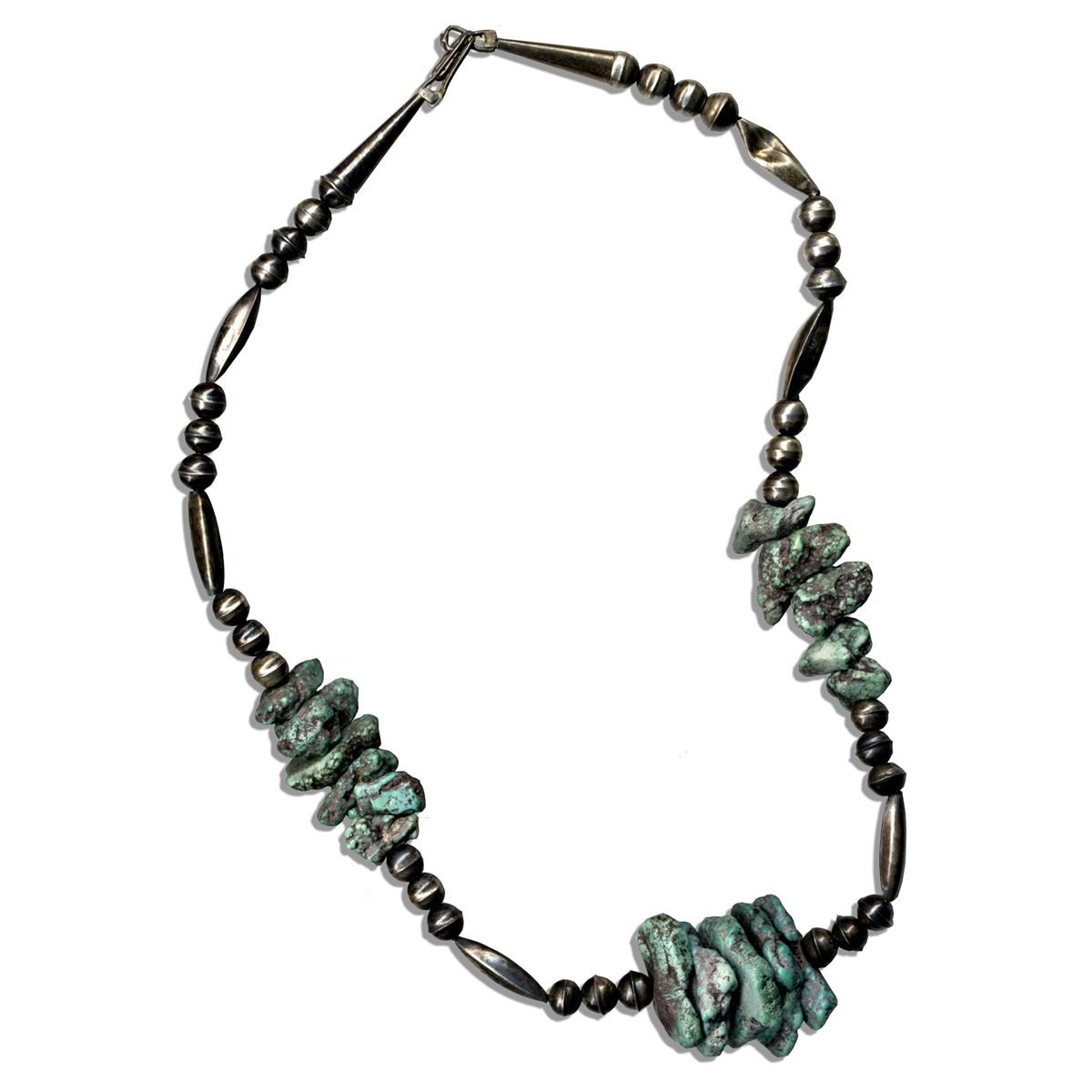 Tennis legend Arthur Ashe personally owned turquoise and silver necklace. Gorgeous necklace features three sections of rock-like turquoise, presumably genuine turquoise, strung between silver beads. Beads are quite tarnished, though can be polished. One of the beads is bent, though hardly noticeable. Measures 12'' from clasp to center. Very good condition. With an LOA from Ashe's widow.