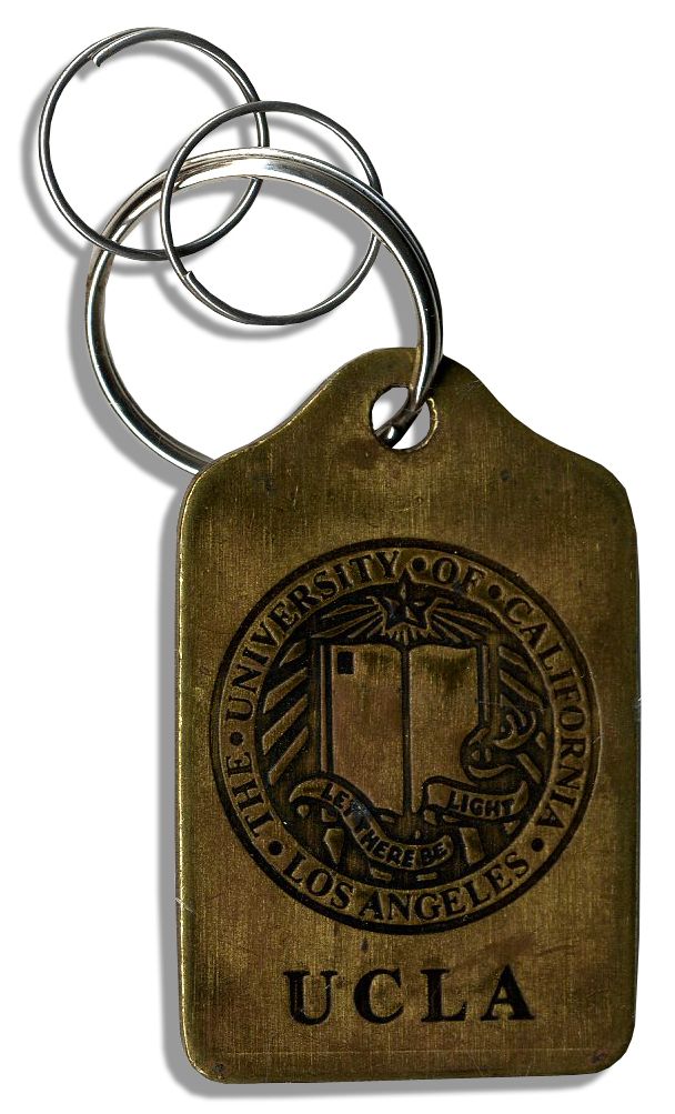 Arthur Ashe's personally owned UCLA key chain. Ashe was awarded a scholarship to UCLA in 1963, and during his time at the school, continued to show signs of becoming a champion player. In 1963, he became the first African American player ever selected for the United States Davis Cup team. Bronze key chain has ''UCLA'' engraved on the bottom with the school's insignia above it. Measures 2.25'' x 1.5'' with minor wear. Very good condition. With an LOA from Ashe's widow.