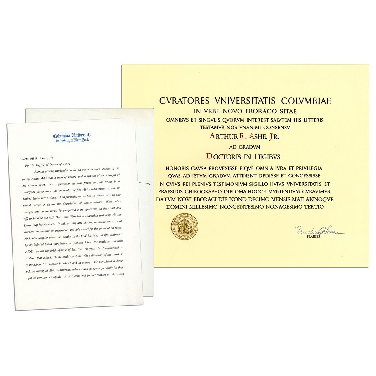 Posthumous degree for Arthur Ashe from Columbia University. Degree in Latin bestows the ''Degree of Doctor of Laws'' to Ashe in May of 1993. Degree is accompanied by a two-page biography of Ashe signed by Michael Sovern, President of Columbia University. Degree is housed in a blue leather folder featuring the seal of Columbia University to the front. Folder measures 14.5'' x 12.5''. Front of folder contains sticker with Ashe's name typed to the lower right corner. Overall near fine. With an LOA from Ashe's widow.