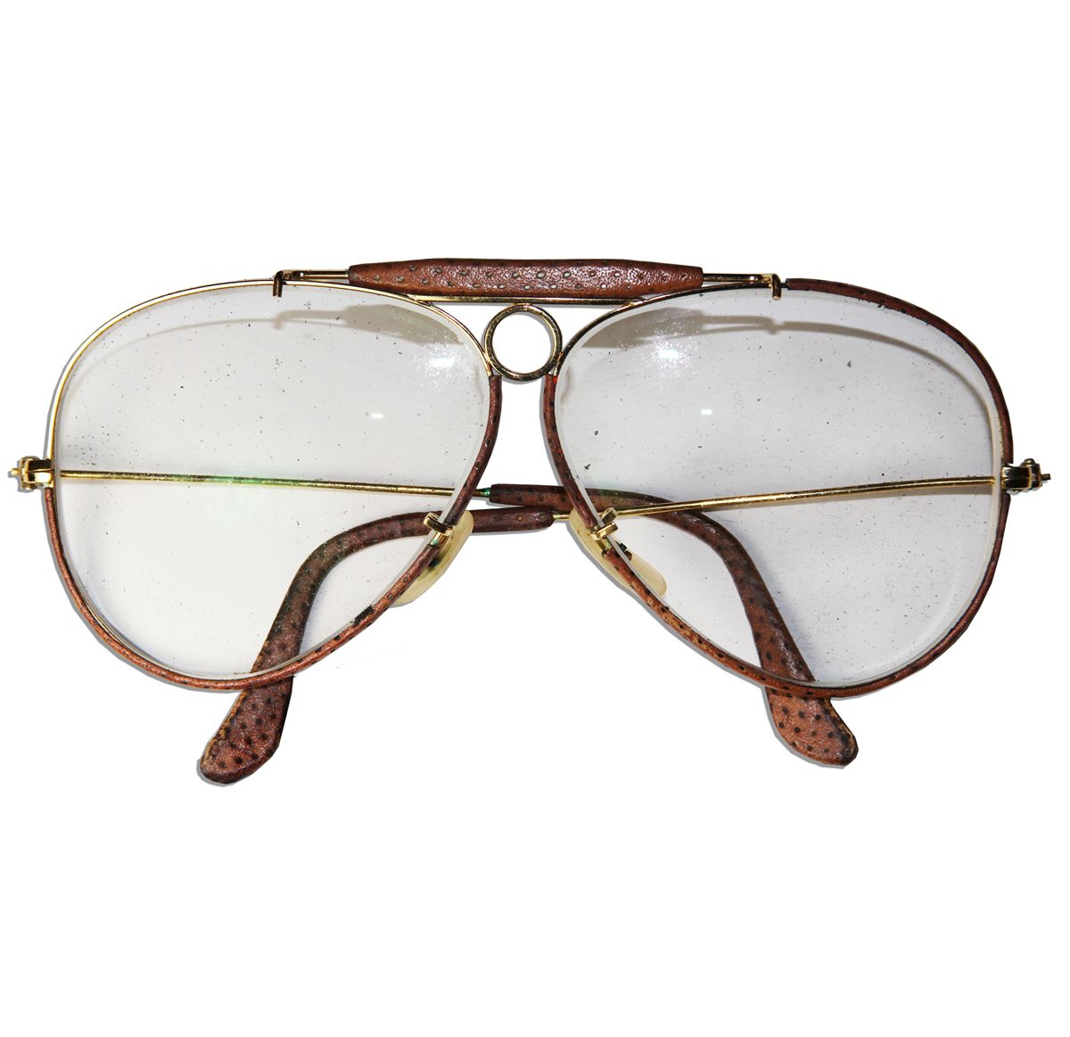 Pair of Arthur Ashe reflection free aviator glasses by Silor. Glasses have brown leather around the bridge and temple tips. Accompanied by a brown leather carrying case. Pocket inside carrying case contains lens cloth and case closes with velcro strap. Velcro of the closure strap is separated from leather part, though could be easily repaired. With an LOA from Ashe's widow. Very good condition.