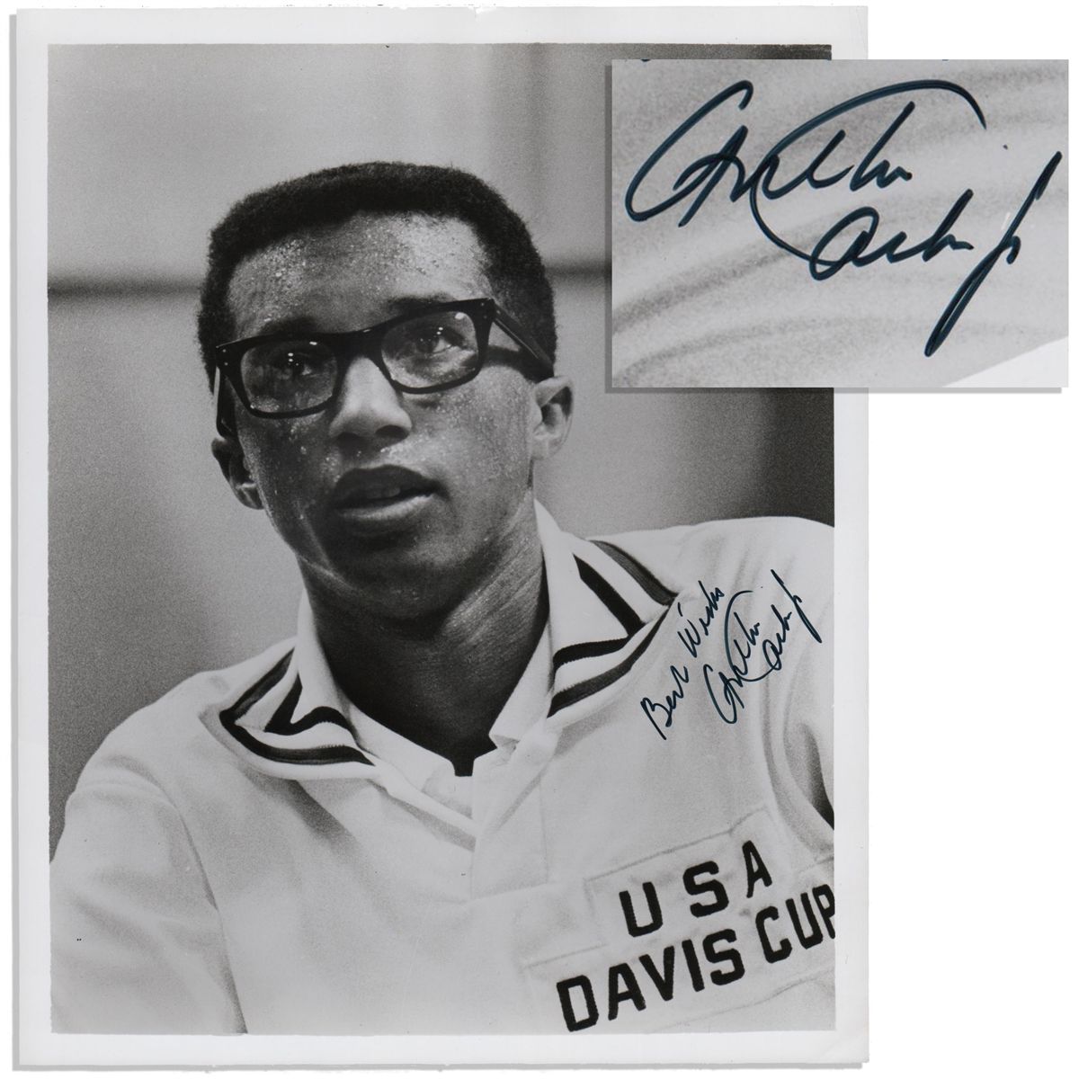 Arthur Ashe signed black-and-white 8'' x 10'' glossy photo. With ''Best Wishes / Arthur Ashe'' written in black marker along the collar of Ashe's ''USA Davis Cup'' collared shirt. With ''Photo by Ed Fernberger'' stamped to verso. Near fine. With an LOA from Ashe's widow.