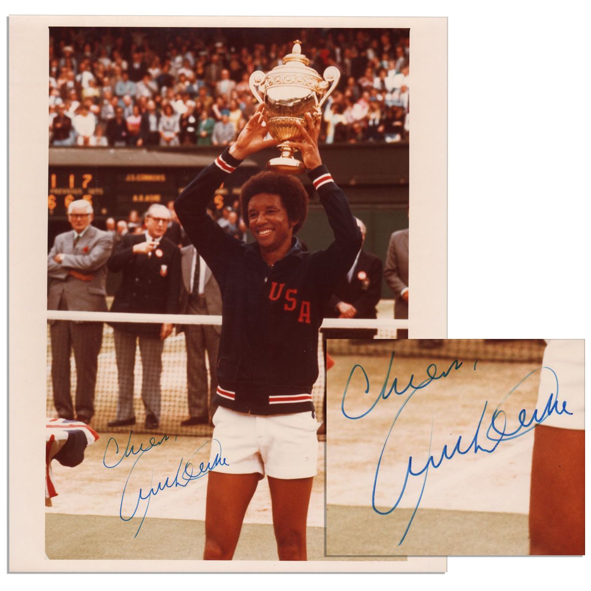 Arthur Ashe signed 8'' x 10'' photo of himself holding his historic 1975 Wimbledon trophy aloft. He inscribes the tennis court, ''Cheers, Arthur Ashe'' in blue ink. Toning and a faint pencil notation to verso of glossy color photograph, else fine. With an LOA from Arthur Ashe's widow.