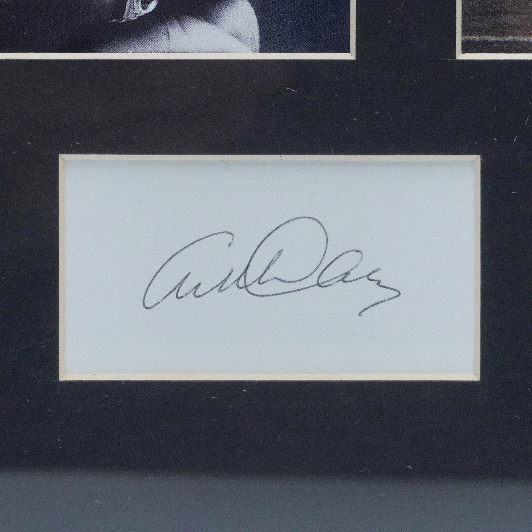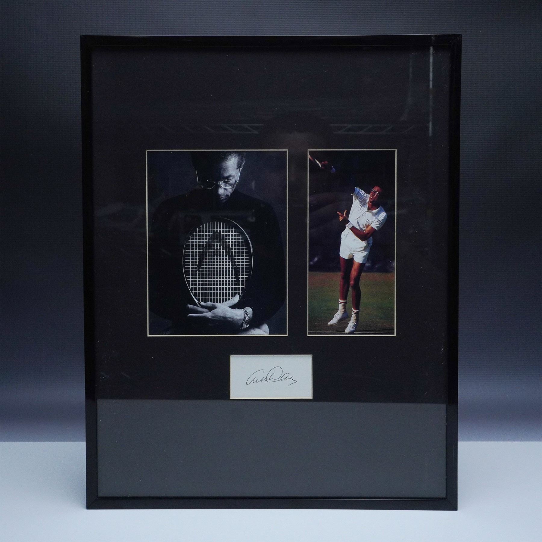 A framed display featuring the signature of legendary tennis player Arthur Ashe, accompanied by two photographs. The left image is a black-and-white portrait of Ashe holding a tennis racket, while the right image captures him in action on the court. The signature is mounted below the photographs, creating a visually striking presentation. The display is housed in a sleek black frame with a matted border.
