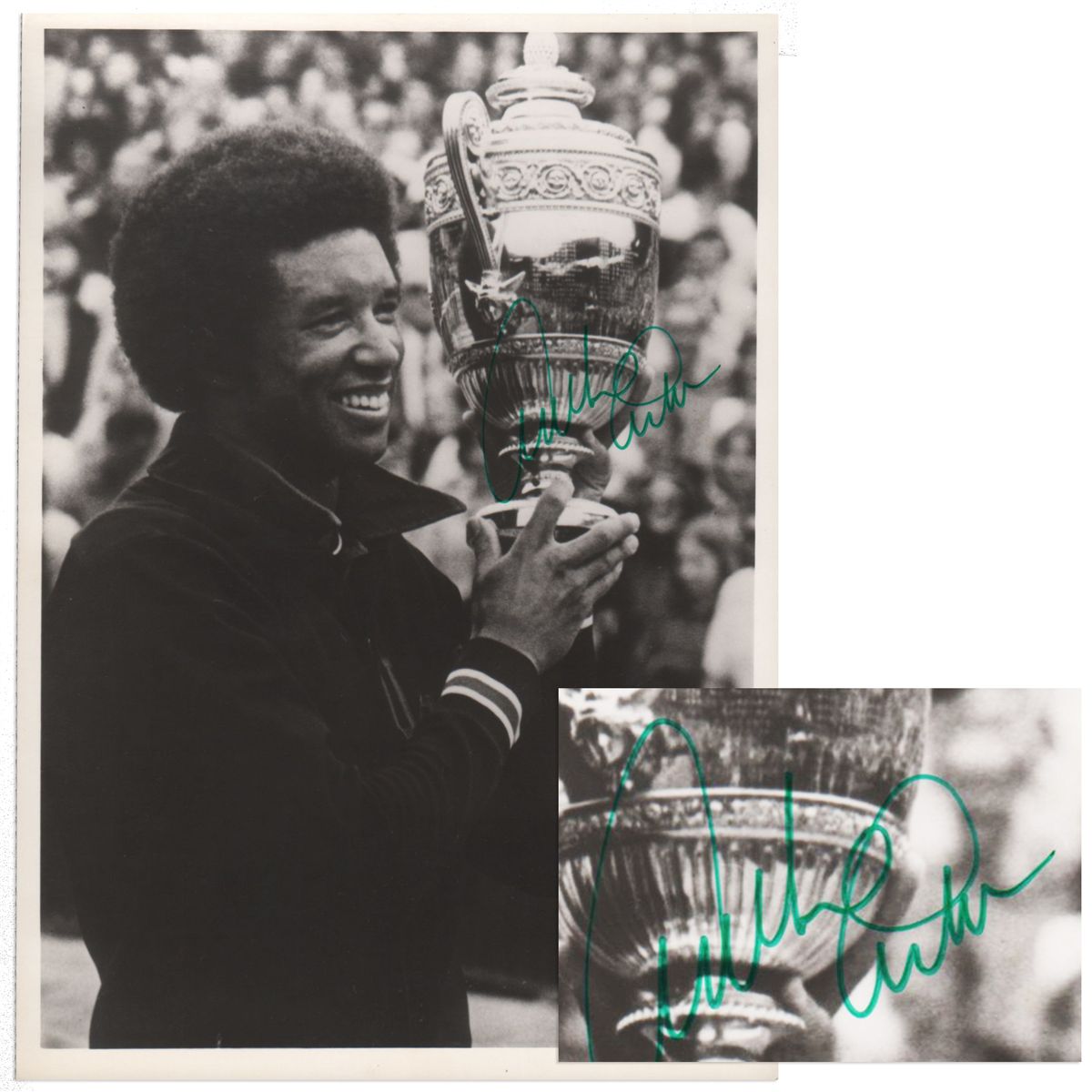 Arthur Ashe signed photo, depicting the tennis legend beaming and holding his Wimbledon trophy at that historic championship. Black-and-white glossy photo is signed ''Arthur Ashe'' in green ink near the trophy base. Measures 5'' x 7'' and is in near fine condition. With an LOA from Ashe's widow.