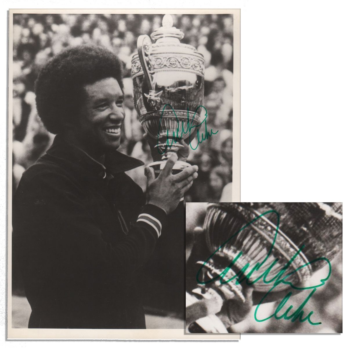 Arthur Ashe signed photo, depicting the tennis legend beaming and holding his Wimbledon trophy at that historic championship. Black-and-white glossy photo is signed ''Arthur Ashe'' in green ink near the trophy base. Measures 5'' x 7'' and is in near fine condition. With an LOA from Ashe's widow.