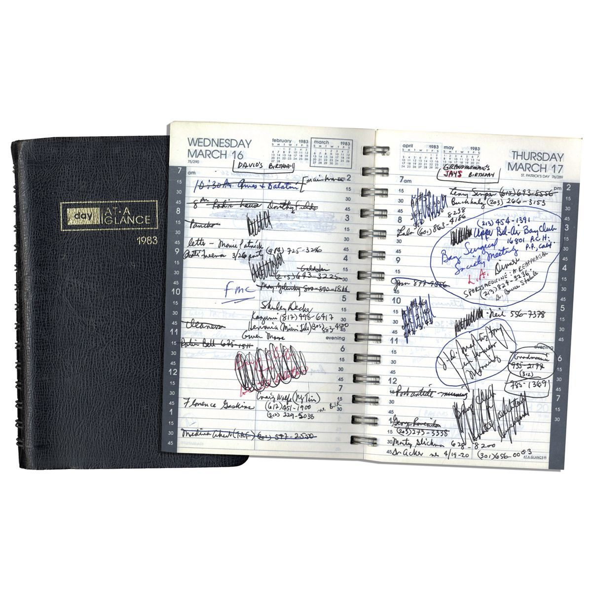 Arthur Ashe's 1983 day planner. Journal was consistently used by Ashe all year to remember appointments and record the important events in his busy life. Ashe's priorities are revealed through his concise, utilitarian entries, which serve as reminders for his various public engagements and events of personal significance to him. After suffering a heart attack in 1979, Ashe was forced to go back for a second heart surgery this year, where, during a blood transfusion, he contracted HIV, though unaware of the virus until 1988. He kept his diagnosis private until 1992, when he became an activist in the anti-AIDS effort before his 1993 passing. Ashe keeps track of sporting events across all disciplines, noting various tennis match-ups throughout the year, including Wimbledon, the U.S. Open and more. He participates in countless civic engagements, speeches and the like, including, for example, ''Prepare Yale Talk'', with most days filled with 7+ meetings. He records personal reminders such as, ''Grandmommie's Jays Birthday'' and ''Parents Anniversary'', and also details trips to Milan, Monte Carlo, Hamburg, and various locations around the world. Notations in Ashe's hand appear on most every page of the spiral-bound Day-At-A-Glance book. Features a black faux-leather soft cover. Measures 5.75'' x 8.25''. Very minor toning, else very good. With an LOA from Arthur Ashe's widow.