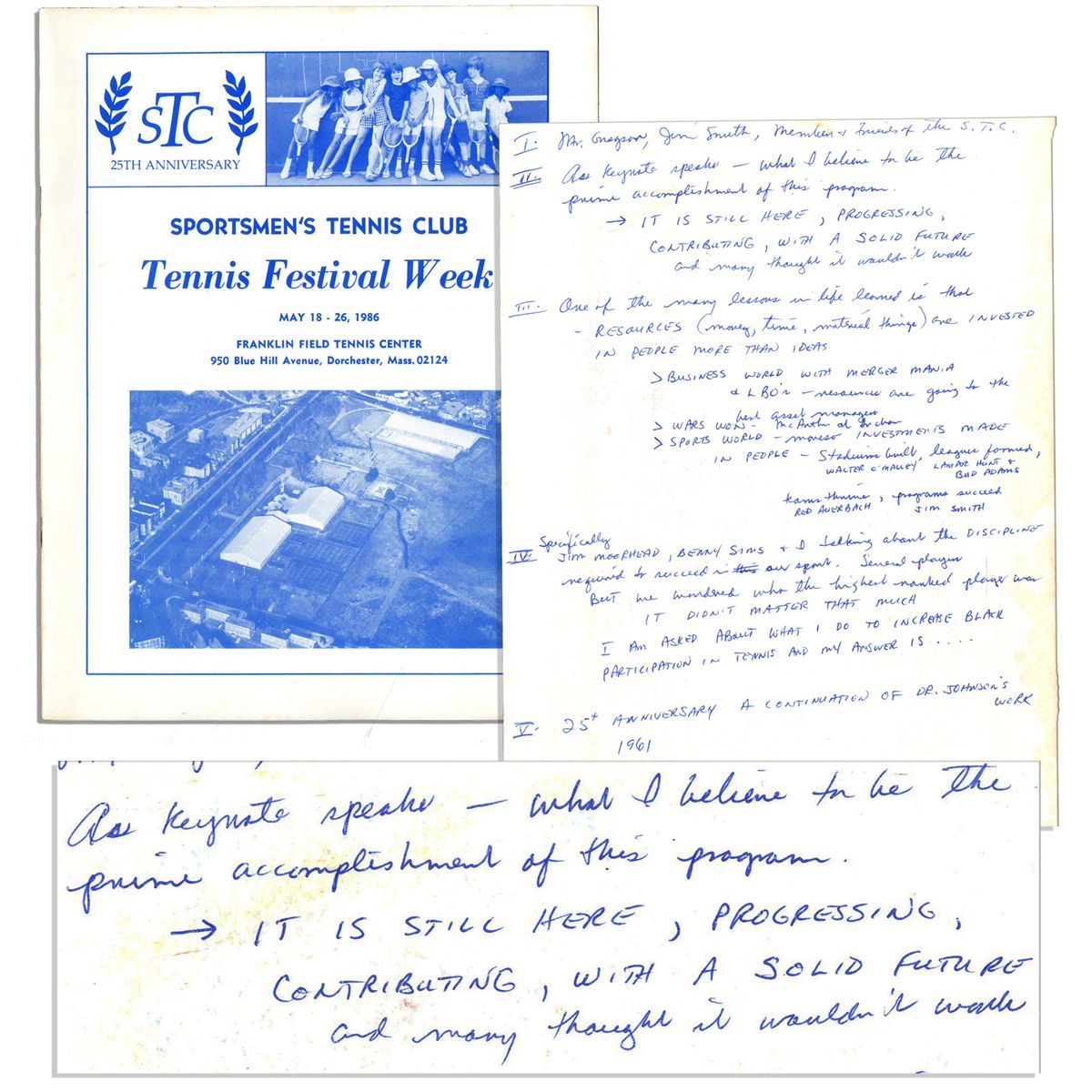 Arthur Ashe's autograph notes on the back of a program from a 1986 tennis event. Ashe was the keynote speaker one day during ''Tennis Festival Week'' at a tennis club in Massachusetts. His notes, presumably for his speech at the event, appear in outline form, composed mostly of scattered names and phrases, with developed content reading in part: ''...As keynote speaker -- what I believe to be the prime accomplishment of this program is it's still here, progressing, contributing, with a solid future and many thought it wouldn't work / One of the many lessons in life learned is that RESOURCES (money, time, material things) are invested in people more than ideas...'' 22pp. program names Ashe twice in its printed contents. Measures 8.5'' Minor toning, else near fine condition. With an LOA from Ashe's widow.