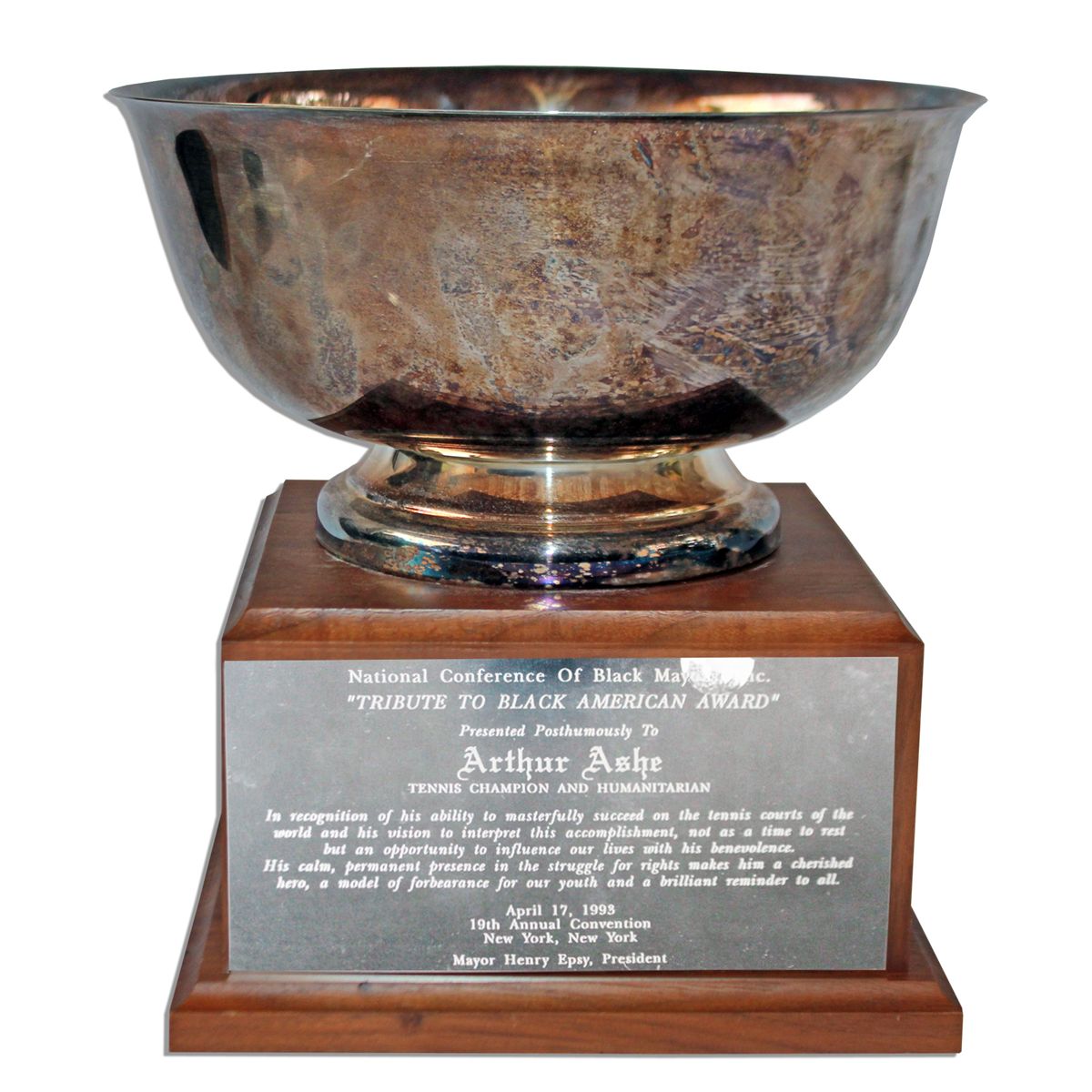 Award posthumously honoring Arthur Ashe given by the National Conference of Black Mayors. Silver bowl sits atop a wooden pedestal with chrome plaque that reads: ''National Conference Of Black Mayors, Inc. / 'Tribute to Black American Award' / Presented Posthumously to / Arthur Ashe / Tennis Champion and Humanitarian / In recognition of his ability to masterfully succeed on the tennis courts of the / world and his vision to interpret this accomplishment, not as a time to rest / but an opportunity to influence our lives with his benevolence. / His calm, permanent presence in the struggle for rights makes him a cherished / hero, a model of forbearance for our youth and a brilliant reminder to all. / April 17, 1993 / 19th Annual Convention / New York, New York / Mayor Henry Epsy, President''. Bowl measures 10'' across and 5.5'' tall. Mounted to an overall height of 10''. Sticker residue to top edge of engraved plate and scattered nicks and scratches to base, with tarnishing to bowl, else fine. With an LOA from Arthur Ashe's widow.