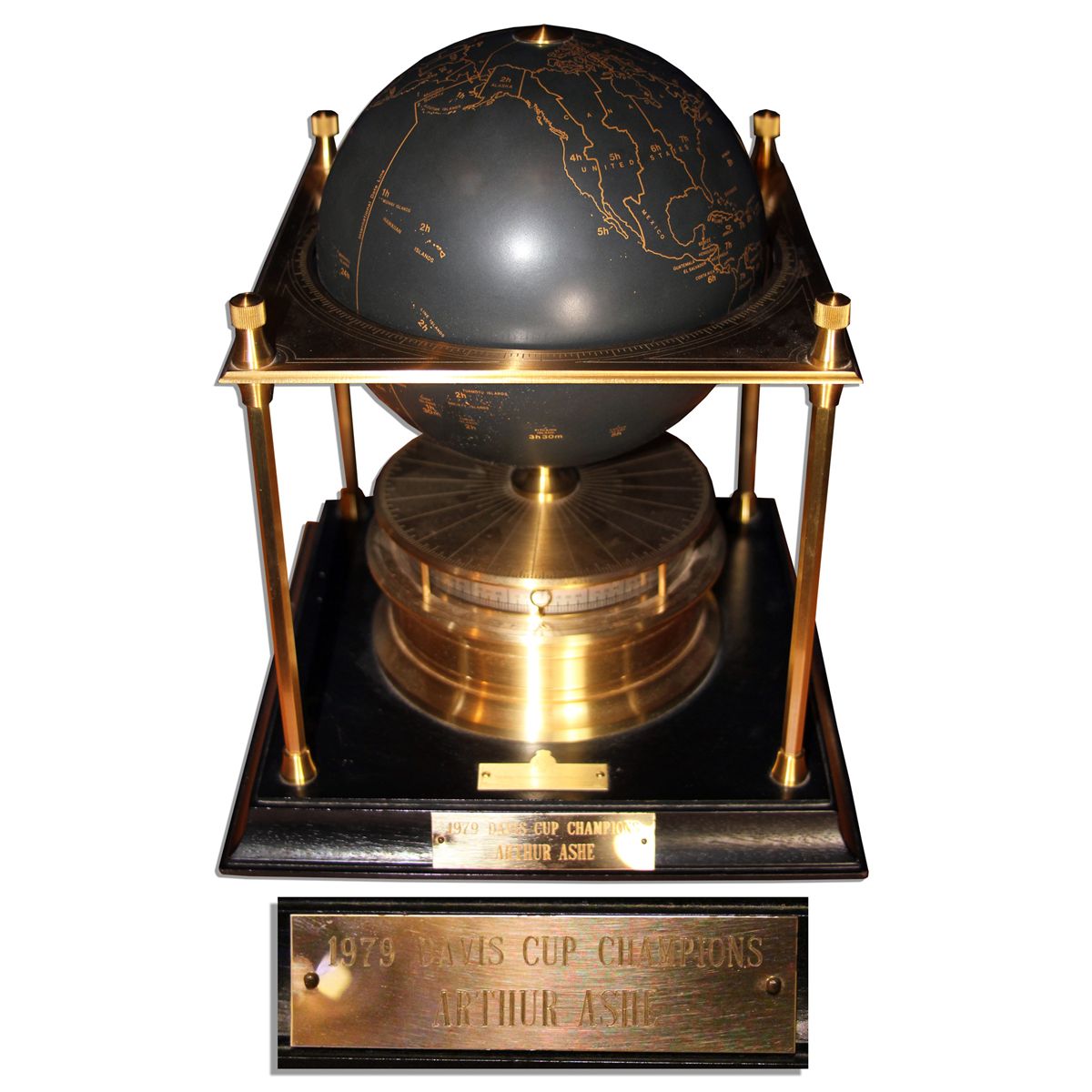 Arthur Ashe's Davis Cup award from the U.S. victory in 1979. The prestigious worldwide tournament is the most important event in men's tennis. In 1963 Ashe made history as the first black player selected for the U.S. Team and in 1979, the year of this award, he was named team captain. The U.S. Davis Cup Team won in the final against Italy in San Francisco on 14-16 December, while Ashe recovered from quadruple bypass surgery he underwent on the 13th. Following the string of heart problems that began with this incident Ashe was diagnosed with toxoplasmosis, which led to his diagnosis with AIDS, from which he died tragically in 1993 at age 49. This elegant award is a globe and world clock mounted to a black wooden base. Slate color globe features the world map and time zones in gilt. A label at the bottom of the base reads, '' 1979 / The Royal Geographical Society World Clock'' and a plaque at the front of the base reads, ''1979 Davis Cup Champions / ARTHUR ASHE''. Measures 10.75'' in height on a 9'' square base. A stunning tribute to the tennis great and civil rights hero. Clock does not function, else fine condition. With an LOA from Arthur Ashe's widow.