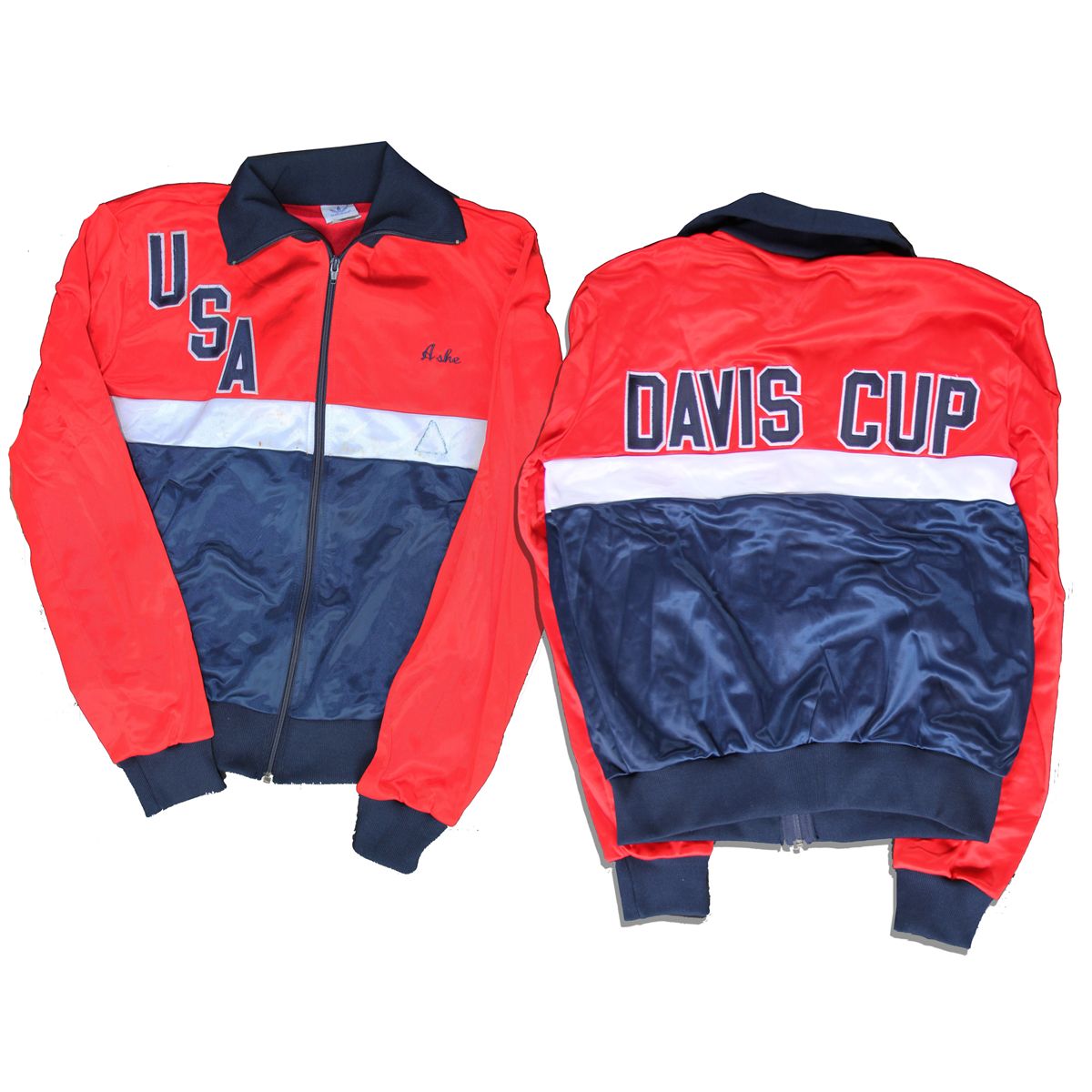 Arthur Ashe's personally issued, owned and worn Davis Cup jacket. Red, white and blue zip-up jacket features lettering sewn onto the back reading, ''DAVIS CUP'' and ''USA'' to the front, with Ashe's name embroidered over the left breast. Adidas brand jacket is a size L. Some soiling from wear and a triangular outline of adhesive residue to the white strip on the front left, else very good. With an LOA from Arthur Ashe's widow.