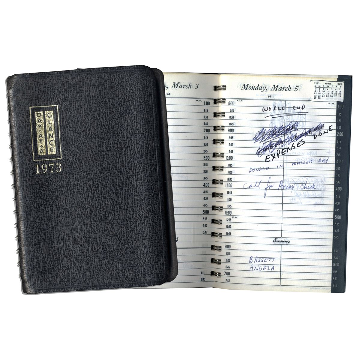 Arthur Ashe's 1973 day planner. Journal was consistently used by Ashe all year to remember appointments at the height of his awe-inspiring career. He published an entire book about the thrilling 1973-1974 year, playing tennis all over the world, called ''Portrait in Motion.'' Ashe's concise, utilitarian entries serve as reminders for his various engagements. He pencils in Angela Bassett, Dionne Warwick, Senator Kennedy, Faruk Kahn and Cosby. He also notes a meeting with fellow tennis pro Bunny Austin and jots a quote from him: ''Bunny: What you are may 'say' more than what I say''. He schedules ''Catalina w/ Okker'', the WCT Doubles, an ATP meeting and of course extensive travel. He comments on one page, ''Got nasty letters from England'' and ''Spent 5 hours writing London Times piece''. Notations in Ashe's hand appear on most pages of the spiral-bound Day-At-A-Glance book. Features a black faux-leather soft cover. Measures 5.75'' x 8.25''. In very good condition, with mild wear to edges. With an LOA from Arthur Ashe's widow. A personal record of each significant day in one of the tennis legend's greatest years.