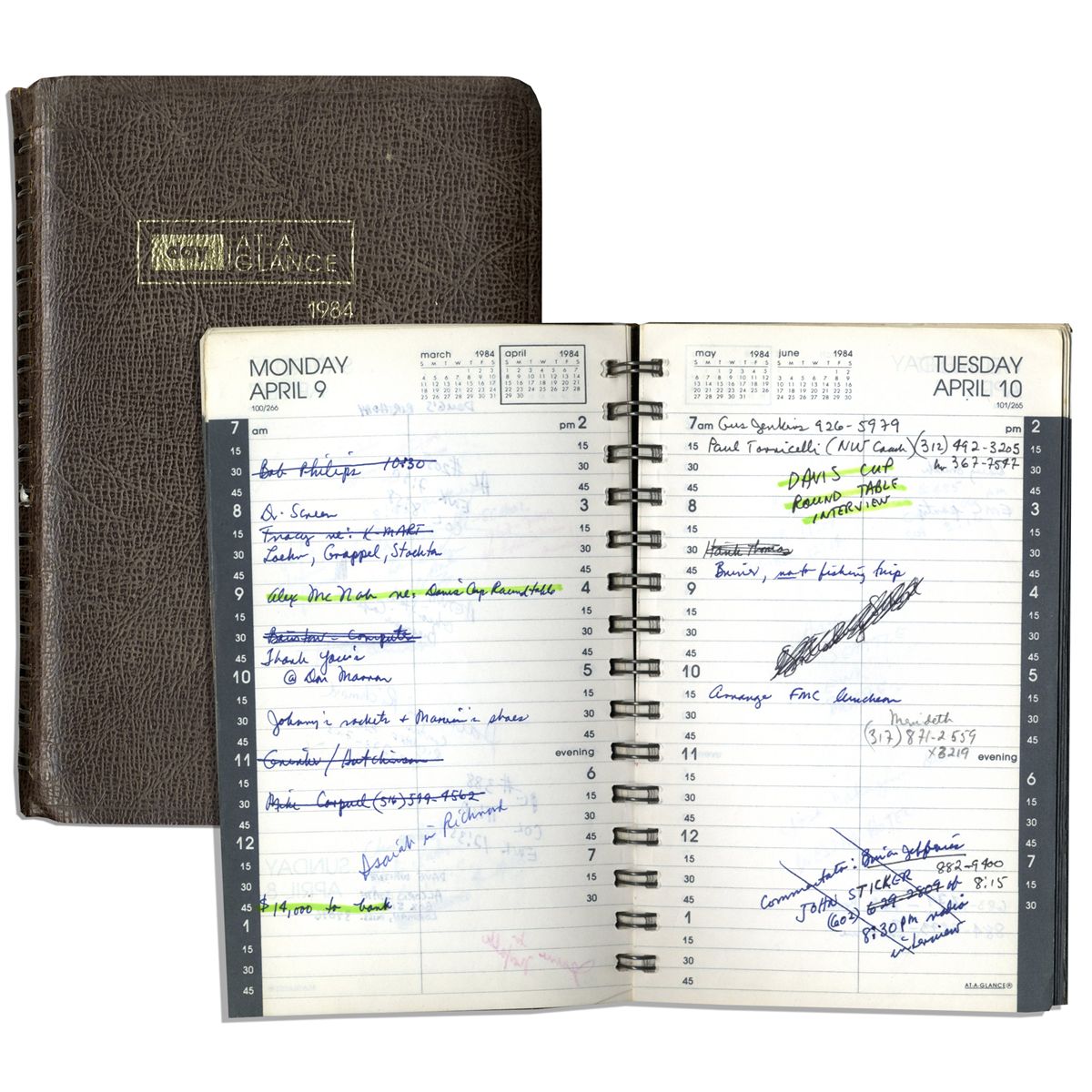 Arthur Ashe's 1984 day planner. Journal was consistently used by Ashe all year to remember appointments and record the important events in his busy life, which changed dramatically just a few years before when he survived a heart attack and retired from tennis. Ashe's priorities are revealed through his concise, utilitarian entries, which serve as reminders for his various public engagements and events of personal significance to him. In tennis, Ashe notes various worldwide match-ups, including Wimbledon, the Davis Cup, the U.S. Open and more. He includes reminders for a Davis Cup round table interview and meetings with the ATP and USTA. He records frequent media appearances, travel and various personal events, birthdays and the like. Ashe also mentions Jesse Jackson, Julio Iglesias and Whoopi Goldberg. Notations in Ashe's hand appear on most every page of the spiral-bound Day-At-A-Glance book, save for a a few days off the whole year. Features a brown faux-leather soft cover. Measures 5.75'' x 8.25''. In very good condition, with mild toning throughout and wear to cover edges. With an LOA from Arthur Ashe's widow.