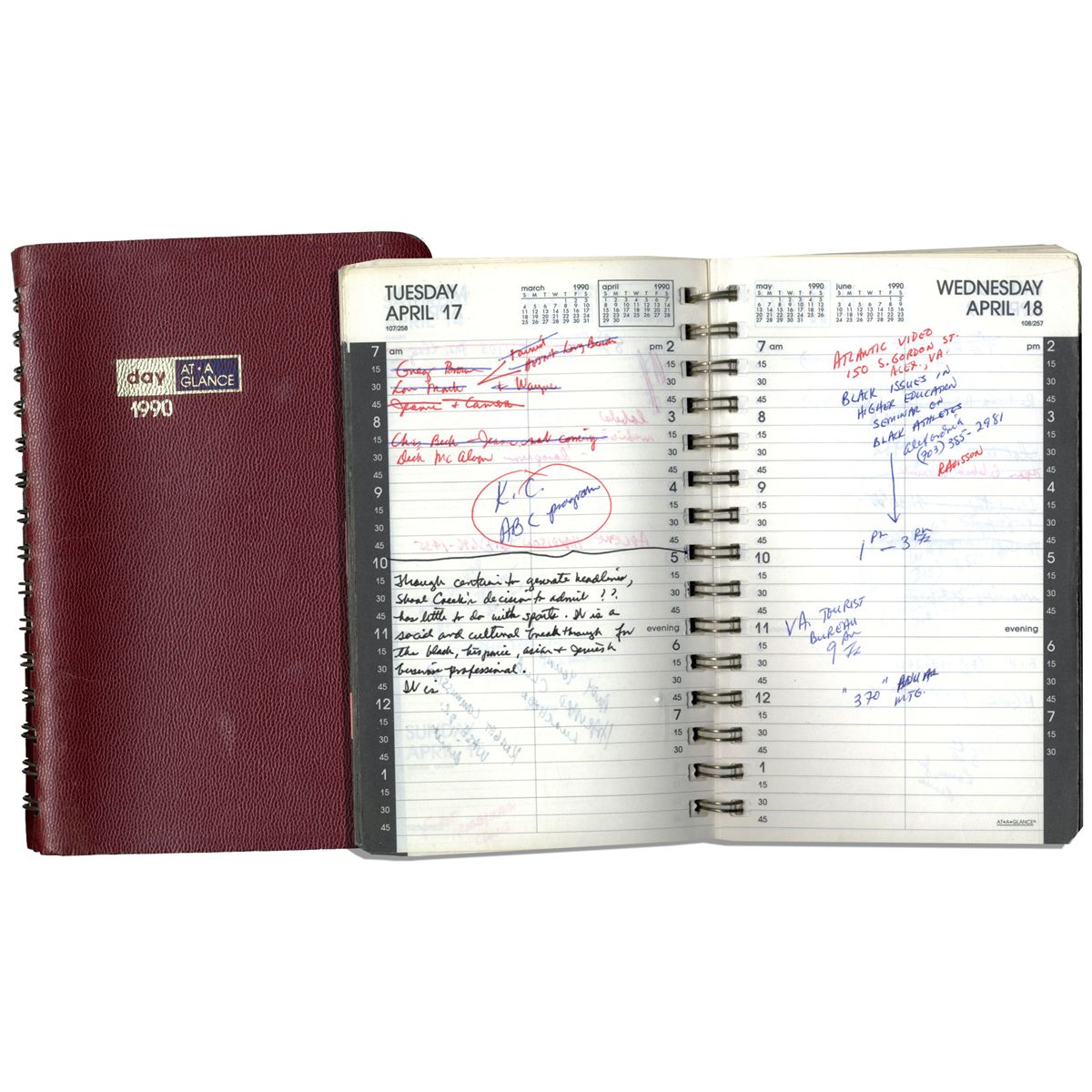 Arthur Ashe's 1990 day planner. Journal was consistently used by Ashe all year to remember appointments and record the important events in his busy life, which would end in just 6 years. Ashe's priorities are revealed through his concise, utilitarian entries, which serve as reminders for his various public engagements and events of personal significance to him. Ashe discovered in 1988 that he had contracted HIV in a blood transfusion, but kept his diagnosis private until 1992, when he became an activist in the anti-AIDS effort before his 1993 passing. In tennis, Ashe here mentions the ATP [Association of Tennis Professionals] dinner and an article he was apparently writing about Wimbledon, and also one for Ebony magazine. On his social calendar, Ashe writes, ''Jackie Robinson dinner / Waldorf Astoria'', ''HBO'', ''Transafrica Dinner'', ''Kean College Honorary Degree'' and ''golf''. In large letters Ashe records, ''MANDELA RELEASED!!'' on that famous day in February. Later he notes, ''NELSON MANDELA ARRIVES'' and ''South African visa application''. Ashe became involved in the struggle to end apartheid in South Africa when he called for the country's removal from the major tennis leagues due to its discriminatory policies. One note regarding the Shoal Creek Country Club reads in full: ''Though certain to generate headlines, Shoal Creek's decision to admit?? [Louis Willie] has little to do with sports. It is a social and cultural break through for the black, Hispanic, Asian & Jewish business professional.'' Shoal Creek Golf and Country Club in Alabama hosted the PGA that year and was the center of a controversy due to its lack of any black members until Willie. Ashe keeps track of tennis and other sporting events, marking the day of the Super Bowl and French Open, U.S. Open and Wimbledon. He records the deaths of Sammy Davis, Jim Henson and Jim Young. Sadly, he writes reminders pertaining to his fragile health including doctors' appointments, blood tests, and notes on prescriptions for Nystatin and Nizoral medications, and pneumonia prophylactic Pentamidine. Notes in the largest letters pertain to his little daughter Camera and read, ''CAMERA'S BIRTHDAY'' and ''CAMERA'S FIRST SWIMMING LESSON!!!'' and one day he jots, ''Beautiful weather 70 [degrees]''. And interesting notation that appears on several different pages is ''Q re: Michael Jackson''. Notations in Ashe's hand appear on almost every single page of the spiral-bound Day-At-A-Glance book. Features a brick red faux-leather soft cover. Measures 5.75'' x 8.25''. In very good condition, with only light wear. With an LOA from Arthur Ashe's widow.