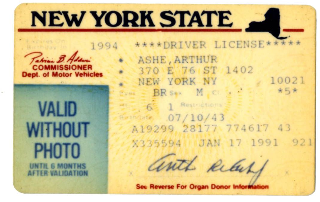 Driver's license of Arthur Ashe. New York state driver's license was issued without photo, however remained ''valid without photo / until 6 months after validation''. Card is signed by Ashe to lower right and measures 3.75'' x 2.25''. Slight wear, overall very good. With an LOA from Ashe's widow.