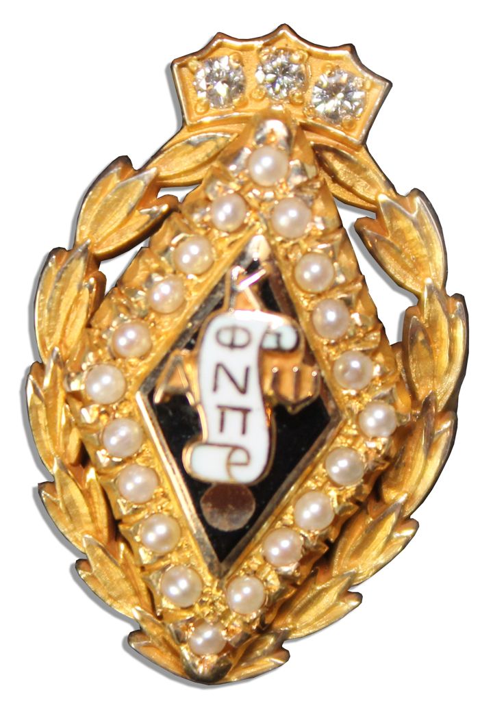 Arthur Ashe's fraternity pin. Ashe joined Kappa Alpha Psi at UCLA, and this beautiful pin features an enamel scroll at the center bearing Greek letters. 14K gold pin measures 0.5'' x 1''. Fine. With an LOA from Arthur Ashe's widow.