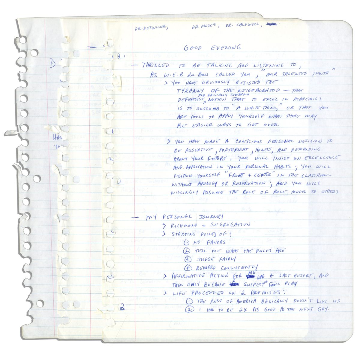Arthur Ashe's speech to black graduates written in his hand. Ashe here drafts a somewhat sobering address to black college students at an unnamed graduation. He first congratulates his audience on their successes, opening with, ''Good Evening / - Thrilled to be talking and listening to, as W.E.B. duBois called you, 'Our Talented Tenth'. You have obviously resisted the tyranny of the neighborhood - that defeatist and basically cowardly notion that to excel in academics is to succumb to a 'white thing' or that you are fools to apply yourself when there may be easier ways to get over...you have made a conscious personal decision to be assertive, forthright, honest, and demanding about your future...and you will willingly assume the role of role model to others...'' He heads the next section, ''My Personal Journey'' and notes ''Richmond & segregation...no favors...'' He discloses, ''...Affirmative action for me was a last resort, and then only because I suspected foul play...The rest of America basically doesn't like us / I had to be 2x as good as the next guy...'' He follows this with a numbered list of 8 heartbreaking predictions for his audience: ''...You: will for the rest of your life be suspected of being where you are because you're a minority (quota)...spend enormous...energy defending your personal self-image...have more difficulty than most getting a loan to buy a house but buying drugs will be easier...society will expect less from you and you may be tempted to believe it...will accumulate a history of hurts by age 50 that could make an HBO movie...black women will have difficulty finding a husband: 6 in 10 at age 30 with B.S. = divorced with one child / 7 in 10 at age 30 with M.S. = single...more likely than most to be the only college graduate in your immediate family, so you will be called upon to take care of more than just your wife/husband & children...by the year 2000 some of you will be working...and you will be a member of the 2nd largest minority in America...'' Under the next section, entitled ''An Ideal Profile (can't miss)'', Ashe writes, ''1.) Graduate of a 4-year school = magna cum laude / work experience / graduate school at Harvard, Stanford, Cal Tech, MIT...Speak Spanish plus Japanese, Chinese, or Russian / Community involvement / A serious hobby''. He concludes with ''Have tried to impart some advice, and I want to wish you good luck, because you'll need it. Congratulations.'' Runs 3pp. on three separate ruled sheets (ideal for framing) torn from a spiral notebook and measuring 8.5'' x 11''. Near fine. With an LOA from Arthur Ashe's widow.