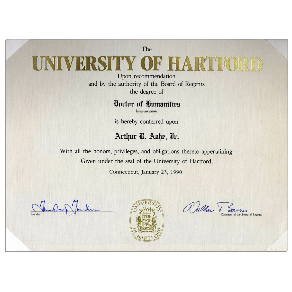 Arthur Ashe University of Hartford honorary degree. Diploma was conferred upon Ashe on 23 January 1990 at the opening of the university's new state of the art sports center. Citation enumerates Ashe's accomplishments in tennis, literature and charity. Fine citation and diploma measure 12'' x 9.25'' and come housed in a black faux-leather cover with gilt insignia to an overall size of 12.75'' x 9.75''. Small abrasion to the right edge of the cover, else fine.