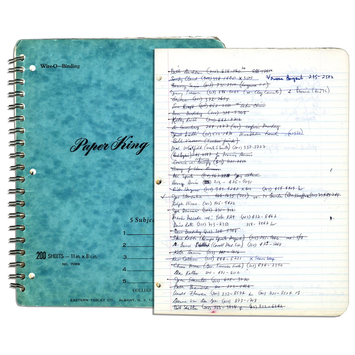 Arthur Ashe's address book. Spiral notebook is filled with the names and numbers of Ashe's contacts written in his hand, with scattered random notations to later pages. Famous names making a cameo in the book include Harry Belafonte and Sugar Ray. He records the address for the NAACP, and notes ''World Tennis Magazine'' and ''Life Magazine''. In two places he reminds himself: ''Wimbledon article 2,000 words on the 70's'', once in ink and again in pencil. One page contains the following: ''The achievements of African Americans in sports competition are exemplary and legendary. In particular, success has been concentrated in The Big Five: baseball, football, basketball, boxing, and such...aided in no small part by...facilities in public schools & public parks...'' Another such note reads, ''...I have coronary artery disease...I have become involved with the AHA because many of the related problems are preventable...'' Also, ''I strongly suggest that Adam and his cohorts read every word of 'The Flip Side of Soul' and heed the advice.'' At one point Ashe creates a timeline of his experience with AIDS in the month of December of 1988: ''12/21/88 blood numbers look good again'' and one entry dated 7 August 1989 reads: ''my numbers are back up but I'm beginning to feel permanently and slightly sluggish...'' Several instances of his blood numbers occur throughout the book. Ashe transcribes Biblical verses - three from Revelations and one from John. With much more content, including references to other tennis players, his ''anti-Apartheid'' friends and contacts, a list of personal qualifications he looks for in scholarship applicants, etc. All 128 sheets in the spiral-bound notebook are written upon in Ashe's hand and account for three years of his life, with the first entries dated early May 1987, and the last dated late April 1990. Most sheets are written on both the front and the back, with over 200 pages of content. Measures 9'' x 11''. Toning and wear to edges, else near fine. With an LOA from Arthur Ashe's widow.