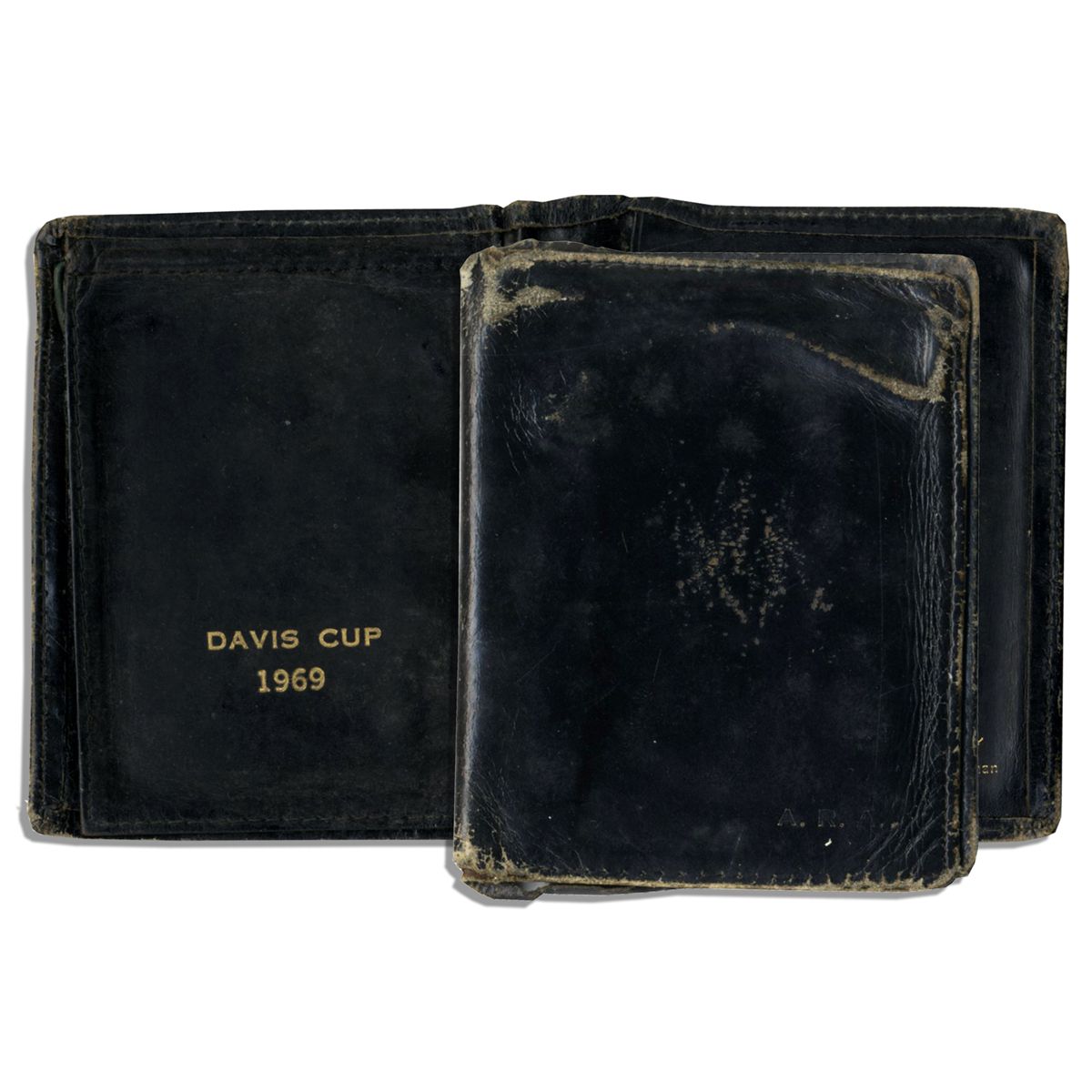 Wallet issued specially for the 1969 Davis Cup, owned and used by Arthur Ashe. Black leather wallet opens to a flap bearing gilt lettering, ''DAIVS CUP / 1969''. Tucked under the flap is a trio of boarding pass stubs from Ashe's travels, with one belonging to his wife Jeanne Moutoussamy. Wallet measures 4'' x 3.25'' closed. Heavy wear to edges and corners, with some separation to bottom edge at fold and a cluster of abrasions to one cover, else very good. With an LOA from Arthur Ashe's widow.