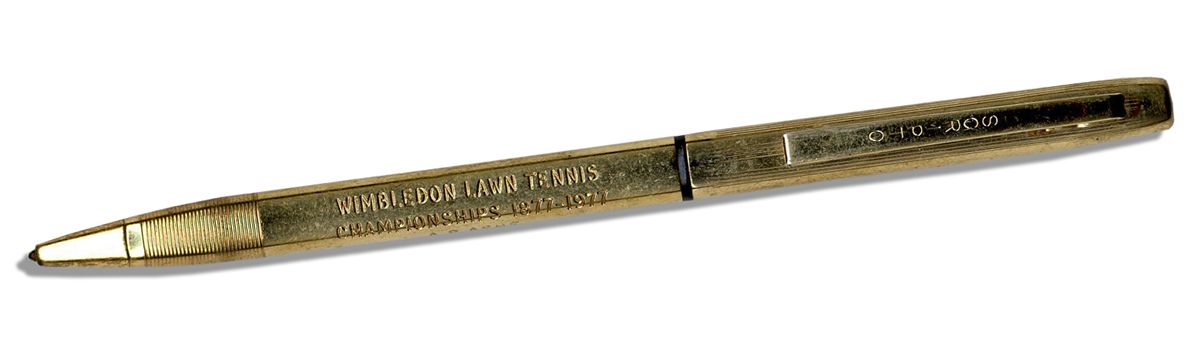 Arthur Ashe's personally owned pen commemorating the 1977 Wimbledon tennis tournament. Ashe forever changed Wimbledon history in 1975 when he defeated his opponent Jimmy Connors, becoming the first African American in history to win the prestigious tournament. ''Scripto'' brand gold pen is engraved ''Wimbledon Lawn Tennis Championships 1877-1977 / A.R. Ashe''. Pen measures 5'' across with very minor tarnishing, else near fine condition and in working condition. With an LOA from Ashe's widow.