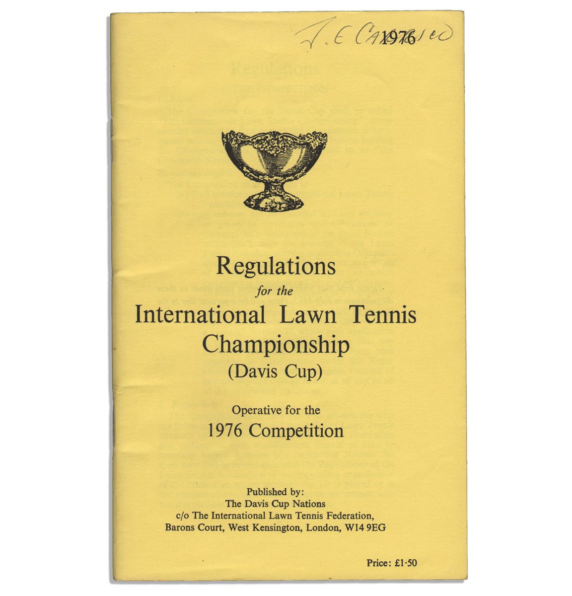 Arthur Ashe's personally owned Davis Cup rules booklet from 1976. Runs 53pp. Measures 5'' x 8''. Ink notation to the upper right corner of the front cover, else fine. With an LOA from Arthur Ashe's widow.