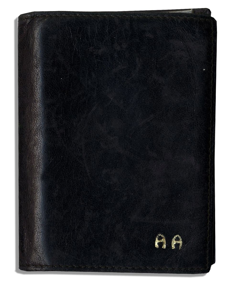 Arthur Ashe's personally owned wallet with his ''AA'' initials engraved to cover. Small black leather wallet still has plastic cardholders filled with a few of Ashe's cards, including an AETNA service card with his name printed on it, an AT&T international phone card, and a card detailing how to leave a message on some sort of an answering machine. Leather wallet measures 3'' x 3.75'' and is worn, presumably from use. Very good overall. With an LOA from Ashe's widow.