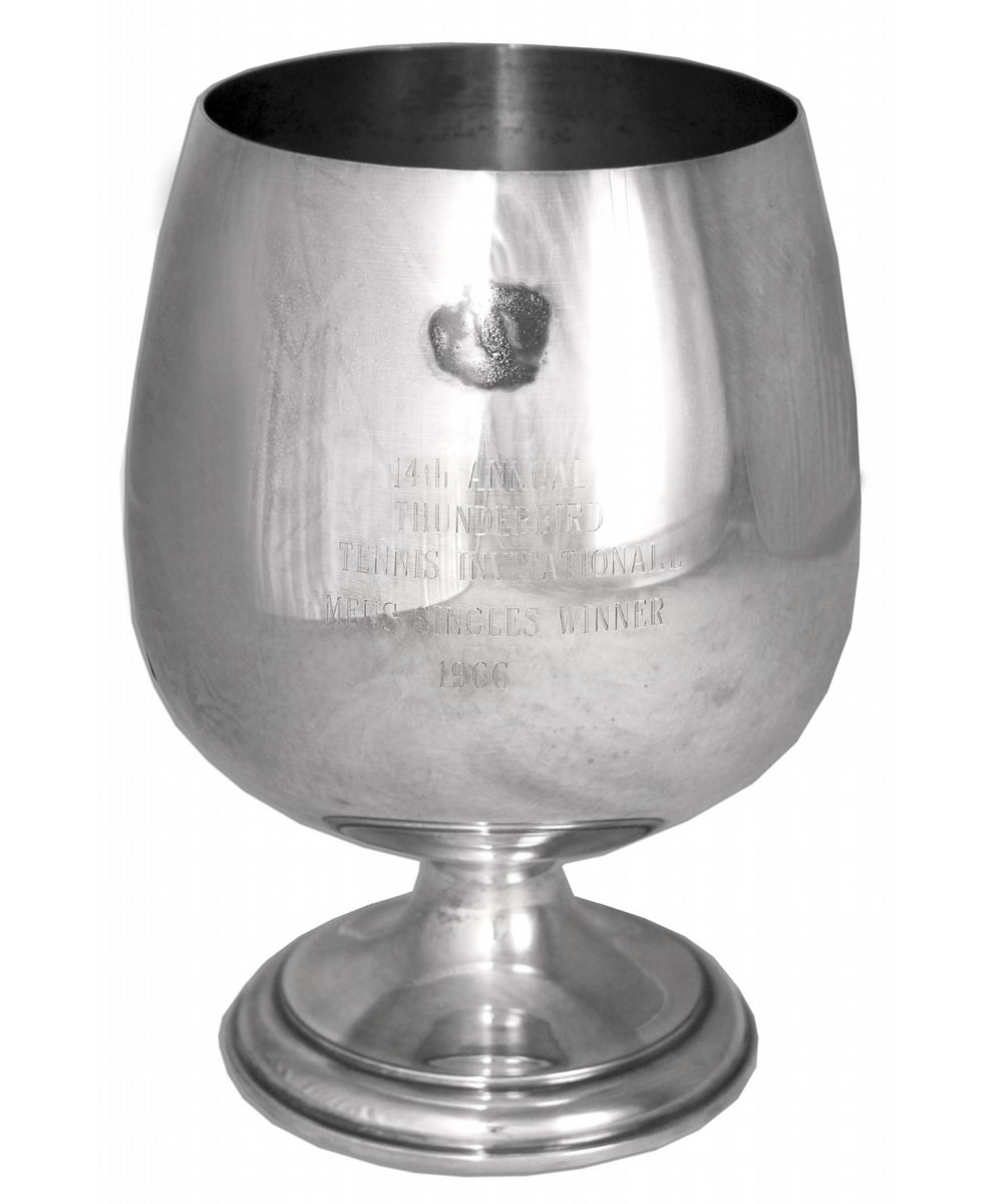 Arthur Ashe's trophy from the 1966 Thunderbird Tennis Invitational. Here, Ashe takes first place in men's singles at the 14th Annual such tournament hosted by the University of British Columbia. At the time, Ashe was studying business on a tennis scholarship at UCLA. Silver-plated copper trophy is engraved ''14th Annual / Thunderbird / Tennis Invitational / Mens Singles Winner / 1966''. Tulip cup has a 5'' diameter mouth and sits on a 4.5'' foot to an overall height of 8.75''. Weighs 1 pound, 9 ounces. With House of Trophies label. Tarnishing with a spot of residue to the top center perhaps from a previously affixed ribbon, else near fine. With an LOA from Arthur Ashe's widow.