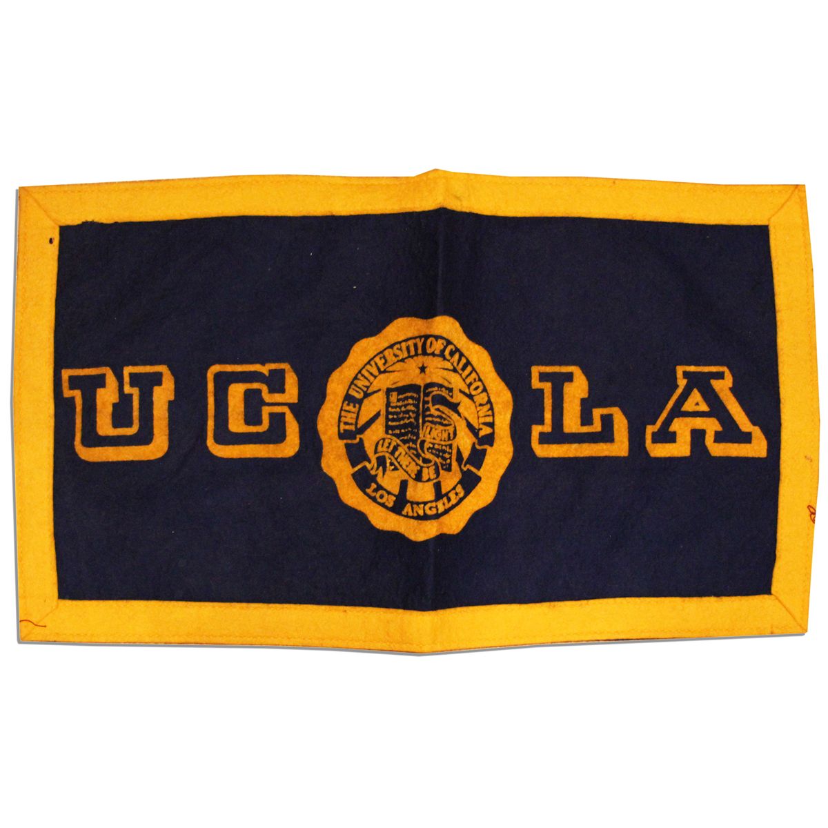 Arthur Ashe's UCLA felt banner. Measures 17'' x 9.5''. Creasing from folding and hole to the upper left corner with minor soiling and pinholes to verso, else near fine. With an LOA from Arthur Ashe's widow.