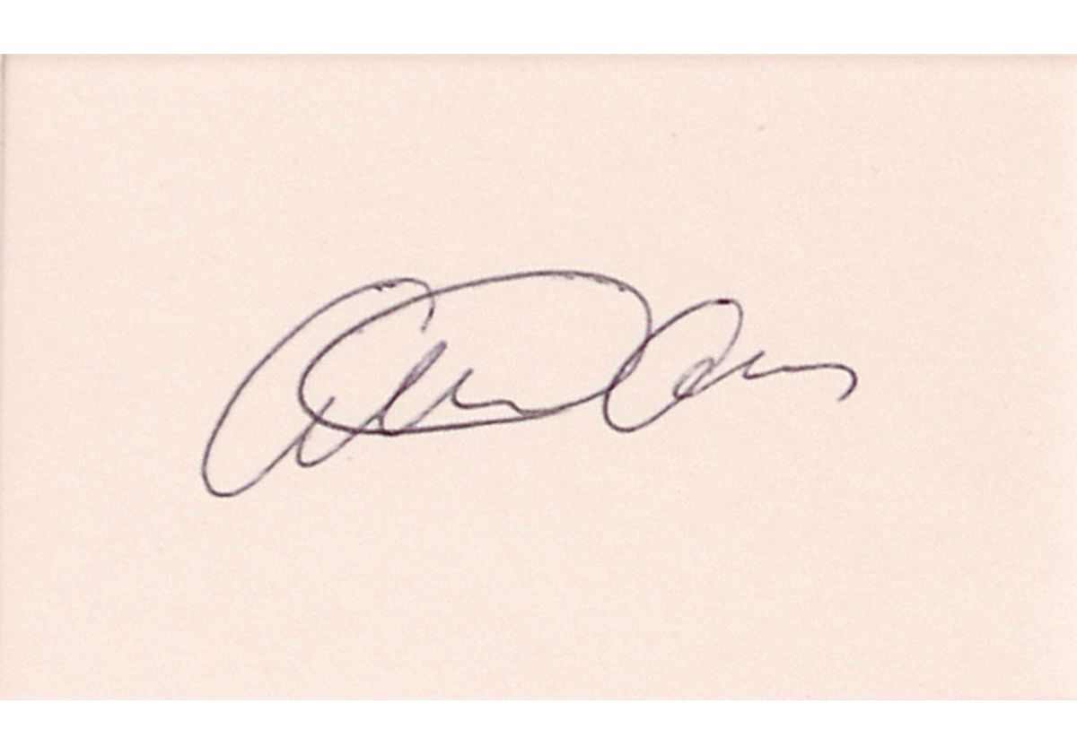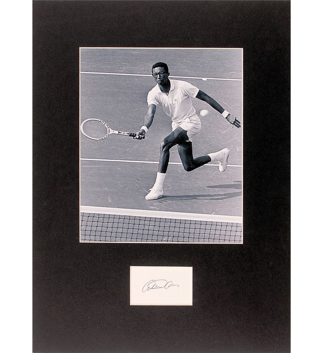 Ballpoint signature, “Arthur Ashe,” on an off-white card. Matted with a photo of Ashe on the court to an overall size of 11 x 15. In fine condition.