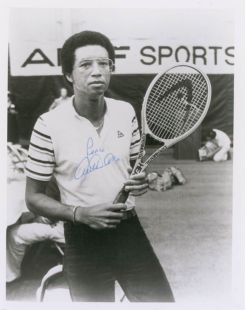 Glossy 8 x 10 photo of Ashe holding a tennis racquet, signed in blue ballpoint, “Peace, Arthur Ashe.” In fine condition.