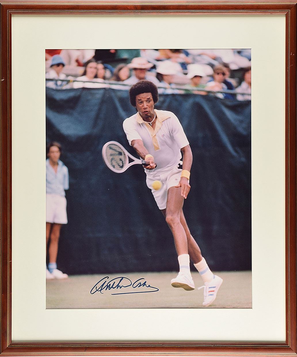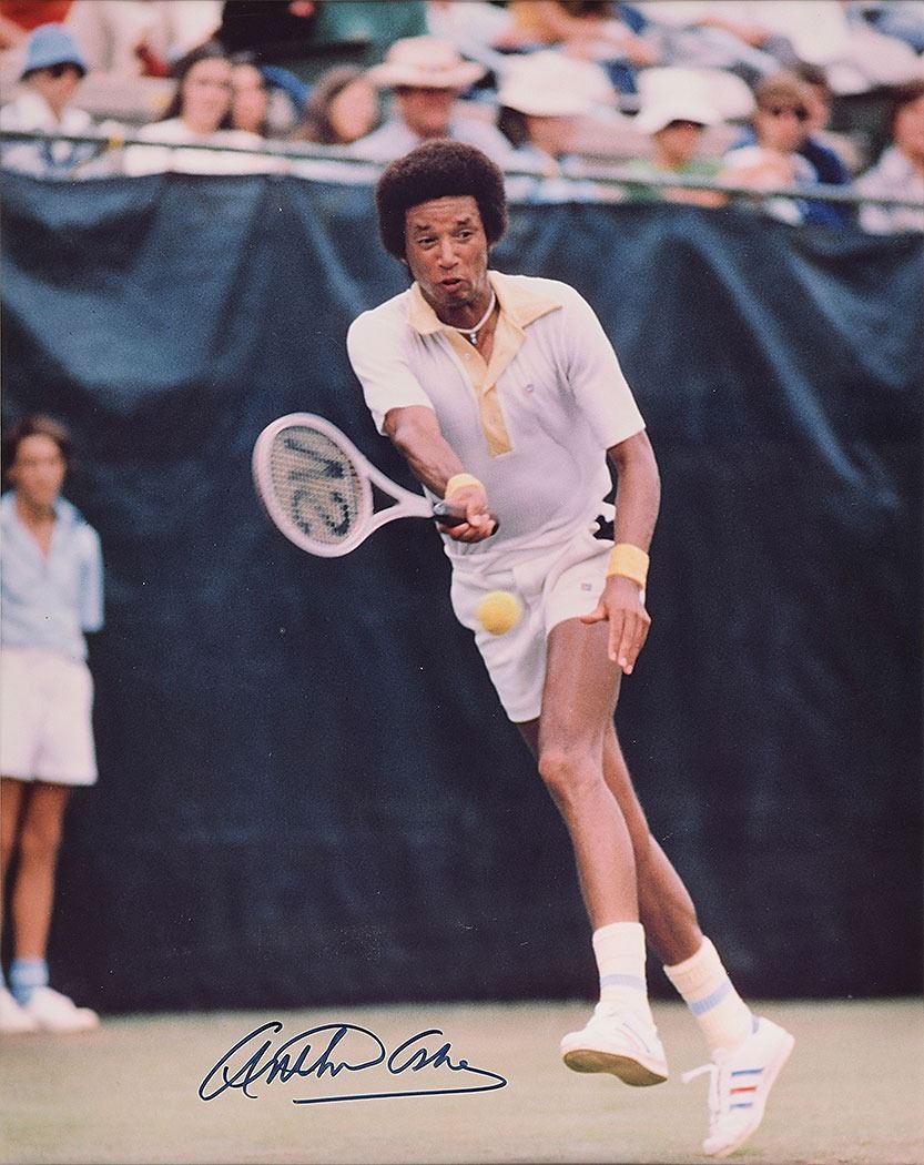 Color satin-finish 15.5 x 19.5 photo of Ashe during a tennis match, signed in black felt tip. Nicely matted and framed to an overall size of 22.5 x 26.5. In fine condition.