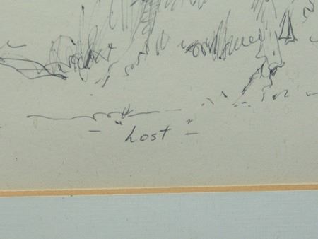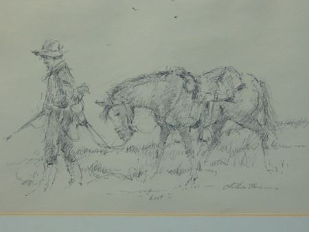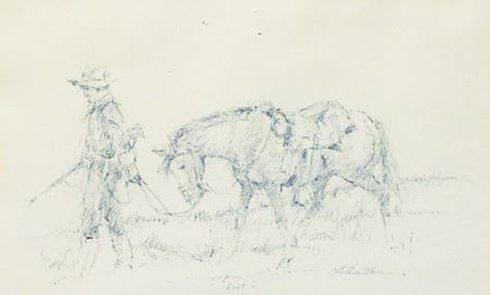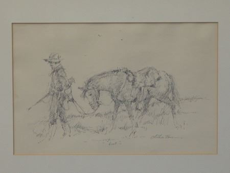 Ca. 1970s, Signed pen and ink depicting a mountain man leading his horse. Very good condition. 7-3/4" x 12" (14-1/2" x 18-1/4" matted)