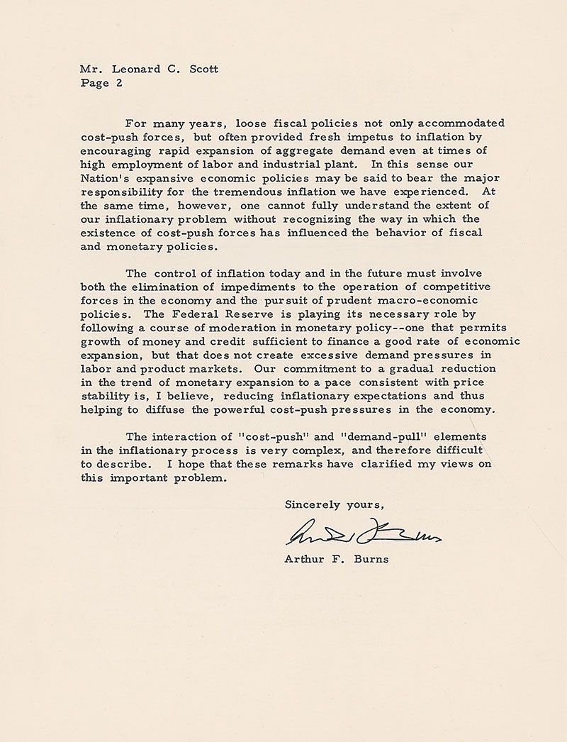 Economist (1904–1987) who served as chairman of the Federal Reserve from 1970 to 1978. TLS, two pages, 8 x 10.5, Federal Reserve letterhead, July 28, 1977. Detailed letter to an economics enthusiast. In part: “‘Cost-push’ forces are an important element in the inflationary process. Monopolistic power exercised by various parties in labor and product markets creates an inflationary bias in the Nation’s cost structure…For many years, loose fiscal policies not only accommodated cost-push forces, but often provided fresh impetus to inflation by encouraging rapid expansion of aggregate demand even at times of high employment of labor…The control of inflation today and in the future must involve both the elimination of impediments to the operation of competitive forces in the economy and the pursuit of prudent macro-economic policies.” In fine condition.